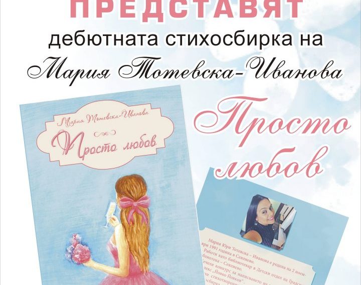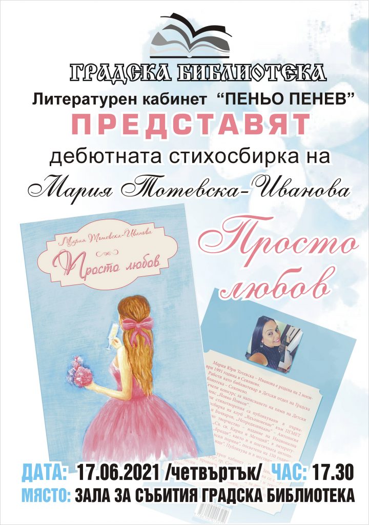 Градската библиотека – Севлиево и литературният кабинет „Пеньо Пенев” представят дебютната стихосбирка „Просто любов” на Мария Тотевска – Иванова. Събитието е планирано за 17 юни от 17:30 часа в залата за събития на Библиотеката.