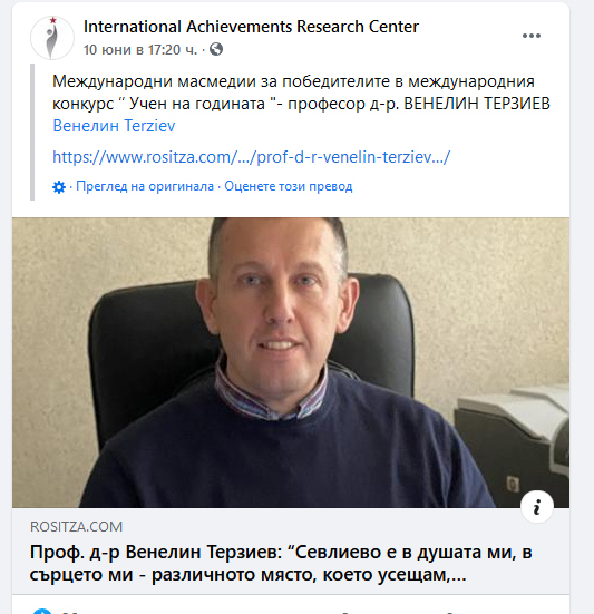 Представихме тази чужда организация, защото в подбора от материали, които представят различни учени, тя е избрала да представи проф. Терзиев с интервю от сайта на в. ”Росица”, при положение, че много български и чуждестранни медии са публикували интервюта с него.