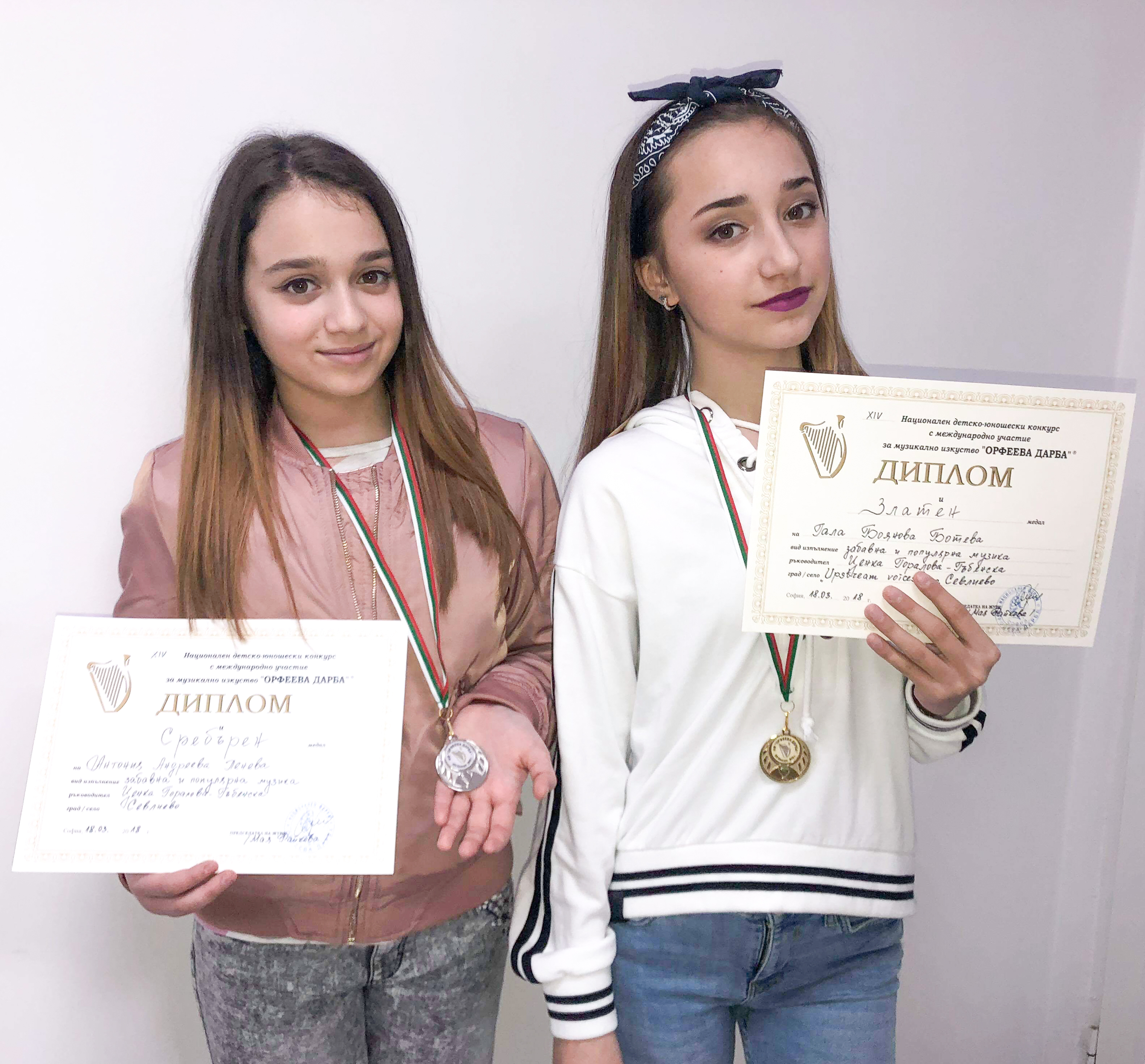 Гала Ботева и Антония Пенева от вокална формация Upstream Voices, с вокален педагог Ценка Горалова, се завърнаха у дома с медали от престижния национален детско-юношески конкурс за музикално изкуство “Орфеева дарба 2018”, провеждан под патронажа на Столичната община. Певческата надпревара се провежда от 17 март до 15 април в столицата, той е включен в културния календар на Министерството на културата, със съдействието на Съюза за музикалните и танцови дейци в България. Талантливите севлиевчета взеха участие във второто направление за изпълнители на популярна музика – солисти и вокални групи, което се проведе на 17 и 18 март в залата на Културния дом в Красно село.