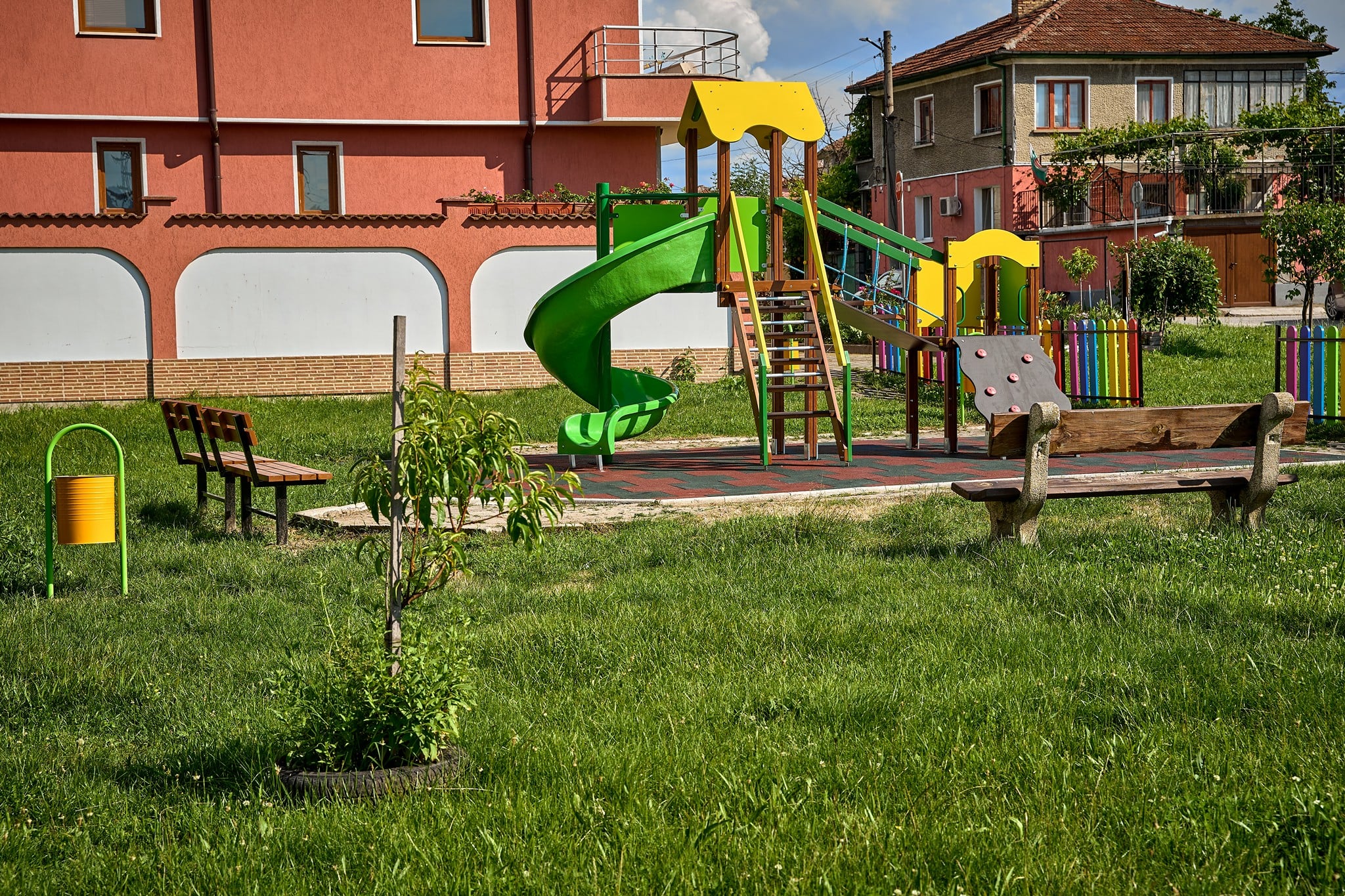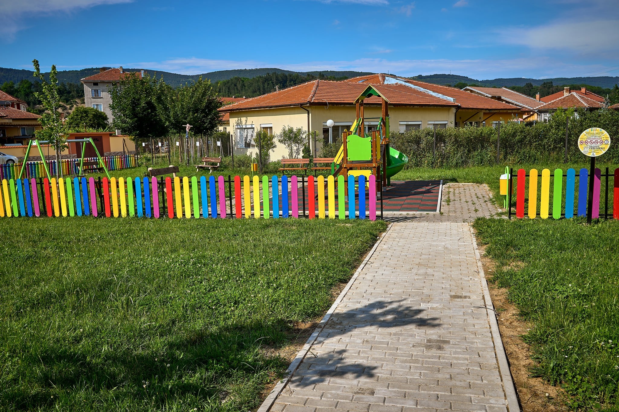 Под игралните съоръжения има нова бетонова настилка, а отгоре е монтирана и ударопоглъщаща настилка, изградена е нова пътека от бетонови павета, а оградата е от дървени цветни ламели. Площадката е оборудвана с множество съоръжения за игри: комбинирано детско съоръжение за деца от 3 до 12 год.; люлка тип „махало“ с две люлки, като едната е предназначен за деца до 3 год. с кош; кошчета за отпадъци и пейки.