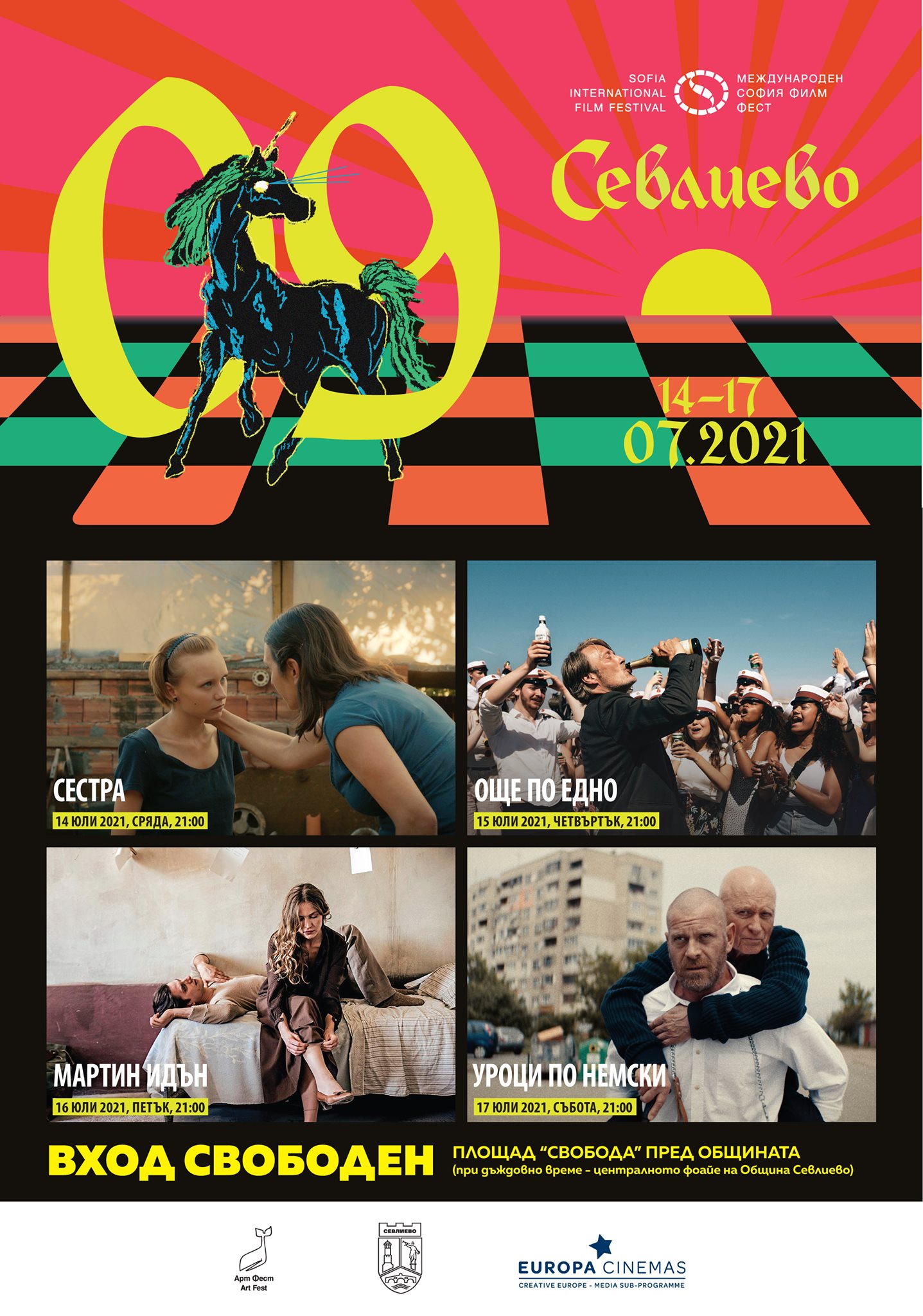 За девета поредна година Арт Фест/София Филм Фест и Община Севлиево ще реализират поредното издание на „София Филм Фест в Севлиево“ – с подкрепата на веригата киносалони Europa Cinemas. Филмовият маратон ще се проведе в четири вечери от 14 до 17 юли, от 21:00 часа, непосредствено след залез слънце, на площад „Свобода“.