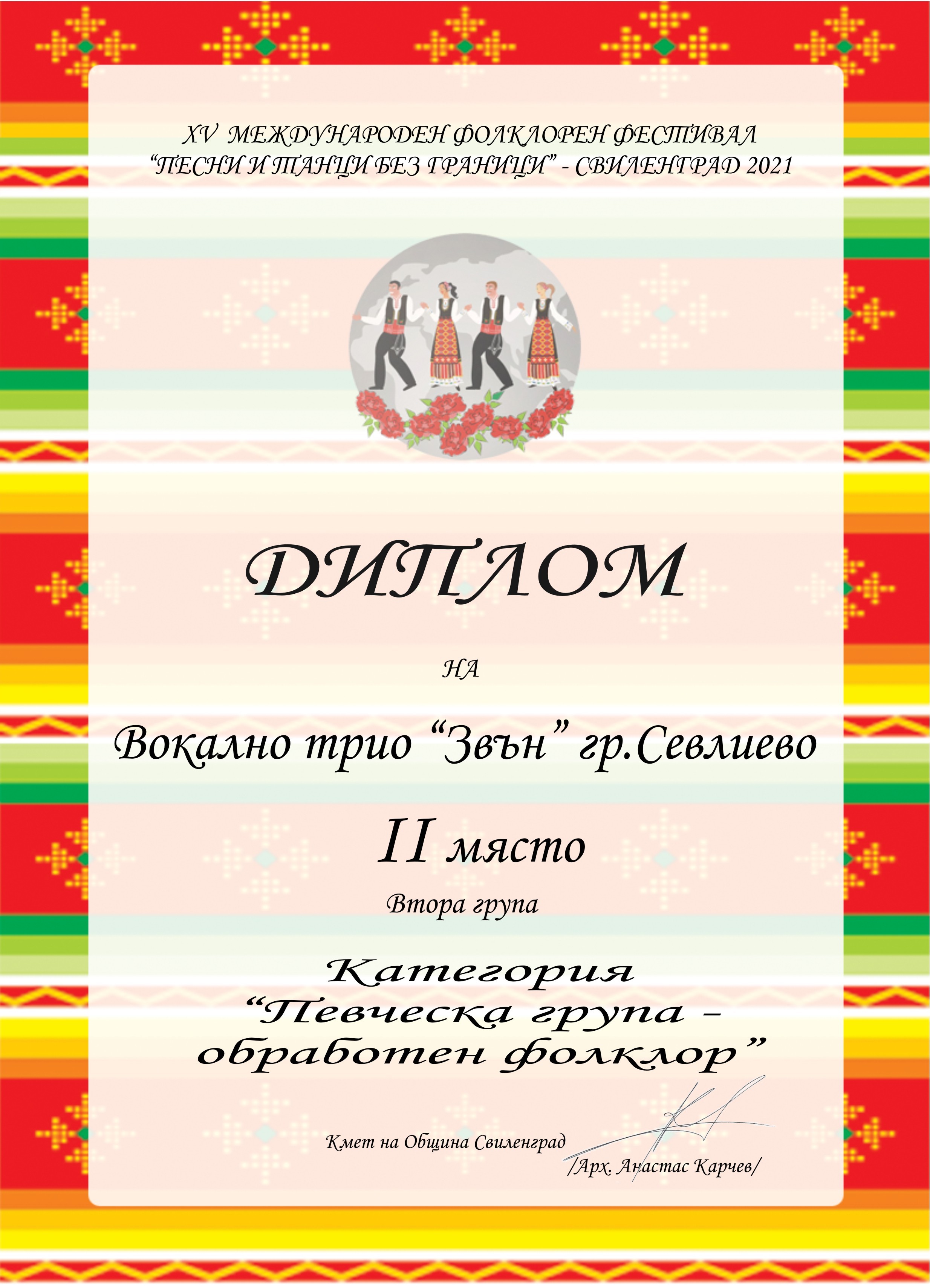 Трио „Звън“ се завърна с втора награда международния фолклорен фестивал „Песни и танци без граници”, който се проведе в Свиленград. Това бе 15-тото му издание. Организираха го Община Свиленград и НЧ „Просвета -1870” под патронажа на кмета арх. Анастас Карчев.