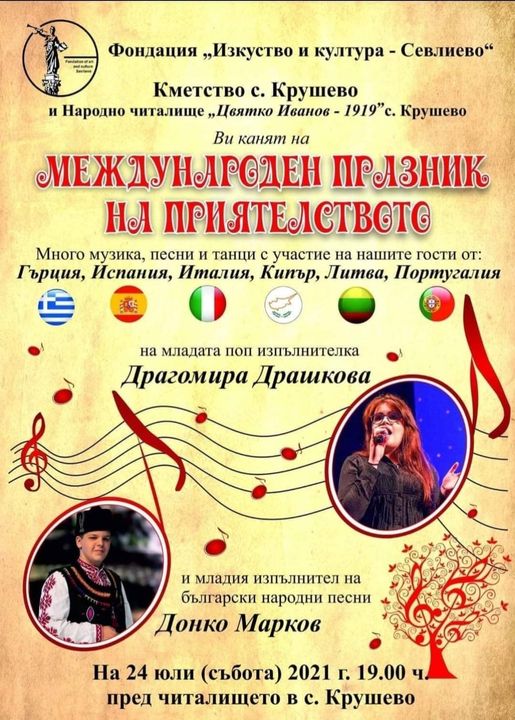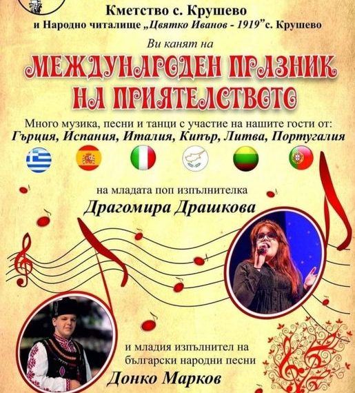 Утре жителите на село Крушево ще посрещнат певци и танцьори от Гърция, Испания, Италия, Кипър, Литва и Португалия. Всички те ще участват в в “Международен празник на приятелството”, организиран от фондация “Изкуство и култура” – Севлиево.