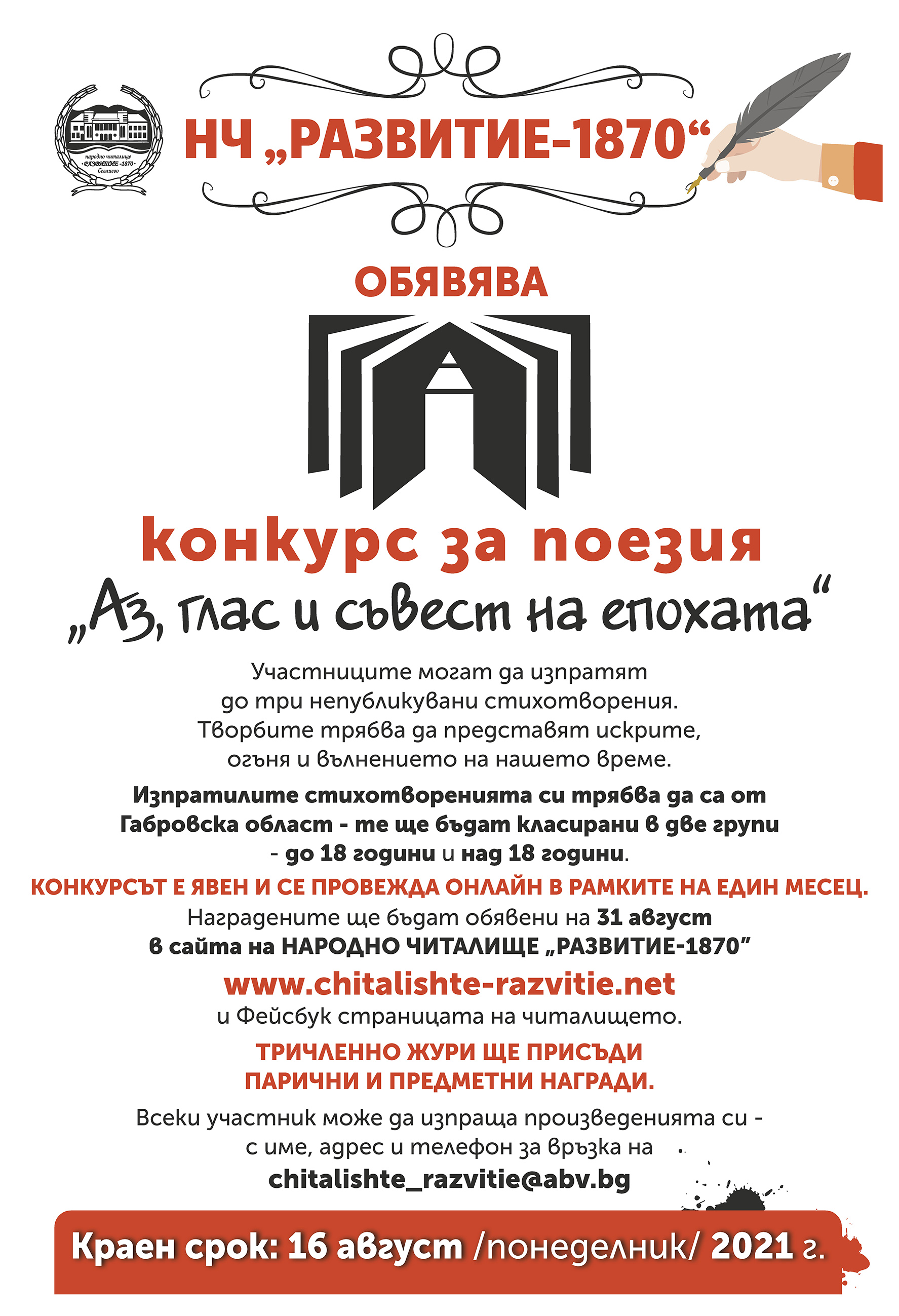 Конкурс за поезия „Аз, глас и съвест на епохата” обявява народно читалище „Развитие-1870”. Участниците могат да изпратят до три непубликувани стихотворения. Творбите трябва да представят искрите, огъня и вълнението на нашето време. Изпратилите стихотворения ще бъдат класирани в две групи – до 18 години и над 18 години.