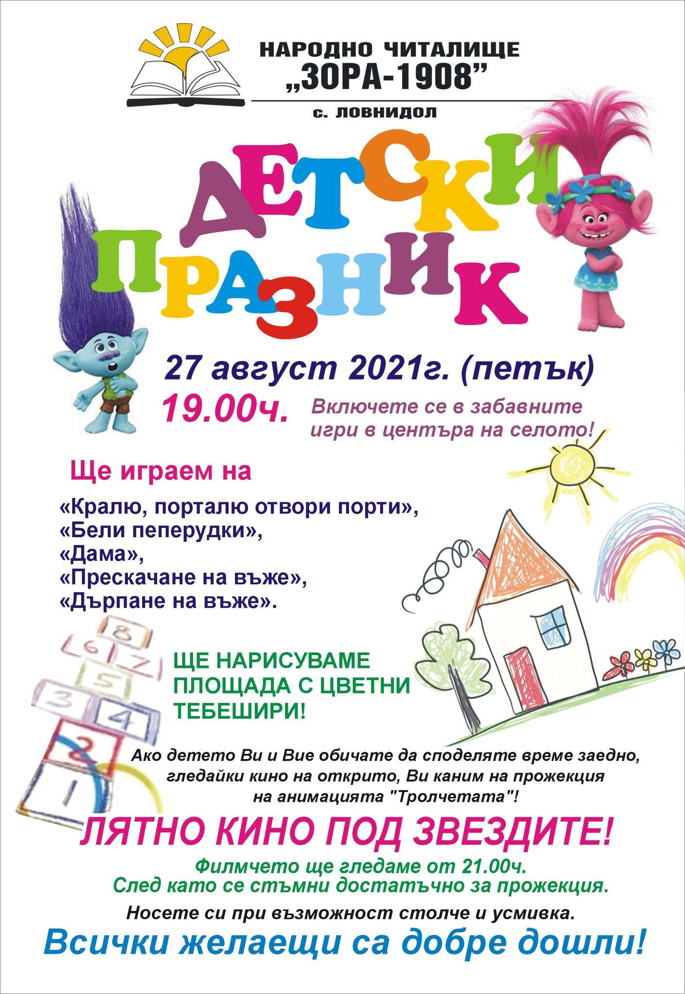 За малчуганите и техните родители ще има и лятно кино под звездите. От 21:00 часа, когато навън е достатъчно тъмно, ще бъде прожектирана анимацията „Тролчетата“. „Носете си по възможност столче и усмивка. Всички желаещи са добре дошли“, приканват организаторите на празника.