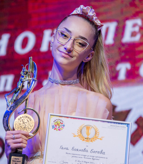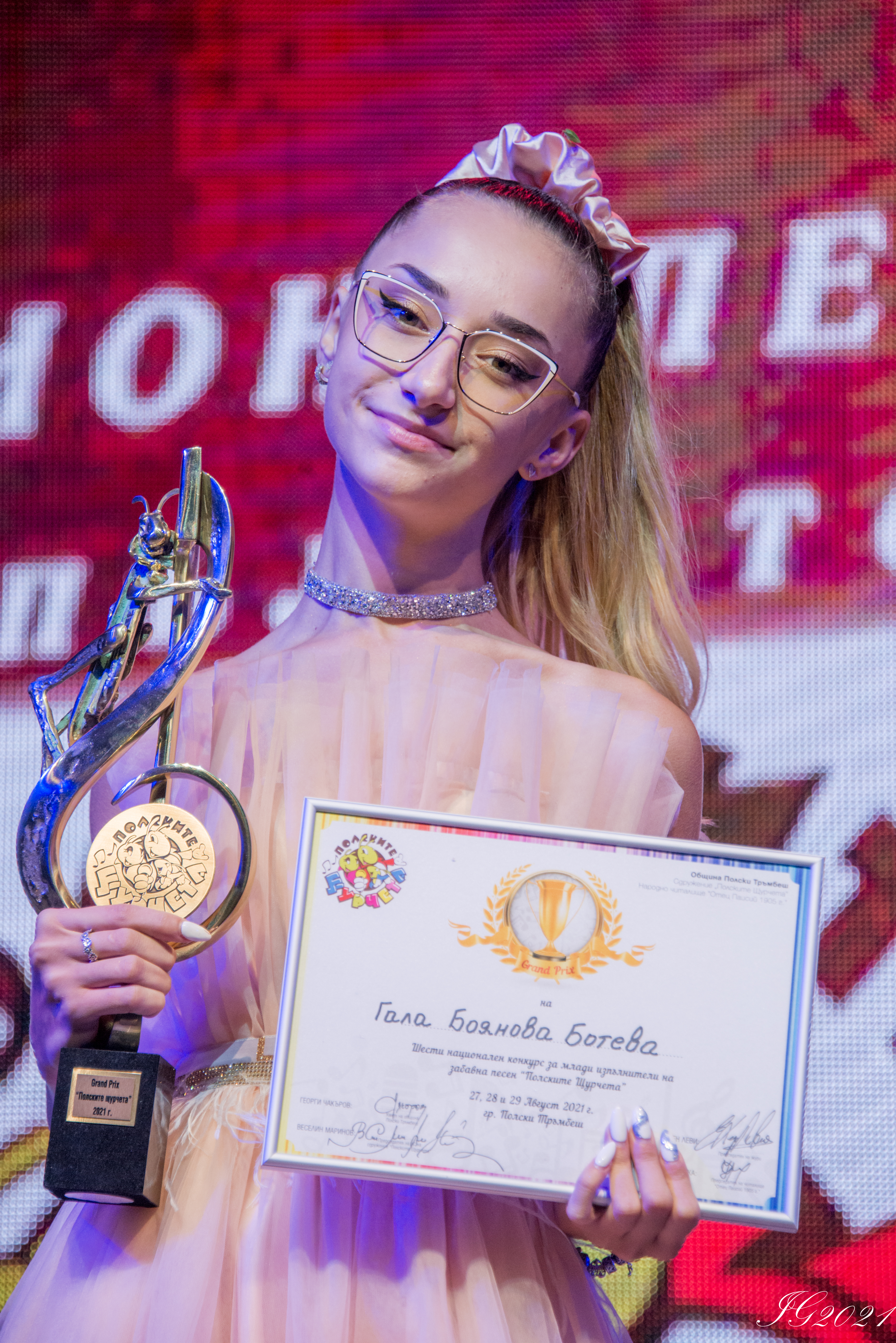 Талантливата Гала Ботева, солистка на ВФ ,, UpstreamVoices” се завърна с голямата награда ,, Гран – При“ от Националния конкурс за популярна музика ,, Полските щурчета“- 2021, гр. Полски Тръмбеш. Младата севлиевска звезда очарова мъжкото жури с председател доц. Етиен Леви- популярен поп изпълнител, преподавател в специалност поп и джаз пеене в НБУ, Красимир Гюлмезов и Светослав Лобошки- автори на много хитове за най- известните ни поп певци. Гала се състезава в четвърта възрастова група и избра да участва в конкурса с песните ,, Остани тази нощ“, прекрас-ната версия на Мария Илиева из ТВ сериала ,, Порталът“ и ,, Killingmesoftly”из репертоара на Джеси Джей. Впечатляваща визия, професионализъм, емоционално изпълнение и желязна психика, това показа Гала Ботева в трите конкурсни дни на сцената на ,, Полските щурчета“ .На Гала- концерта Етиен Леви връчи тържествено на щастливата изпълнителка авторска статуетка, диплом и парична премия. Възпитаничката на Ценка Горалова участва за пети път на този прекрасен форум и за втори път печели голямата статуетка. Преди години най- голямата награда Гала печели във втора възрастова група. Далия Ковачева се класира на трето място в трета възрастова група след изключително голяма конкуренция на голям брой много добри певци от водещи вокални школи в страната. Талантливата габровска певица се представи с песните ,, Кажи ми докога“из репертоара на Маргарита Хранова и ,,Bigtime”,популярен хит из мюзикъла ,, Bedgirls”. Далия бе изключи-телно емоционална, със стабилна интонация, сценично поведение и прекрасна визия.Преди изпълнението си на Гала- концерта тя получи диплом и красива статуетка.