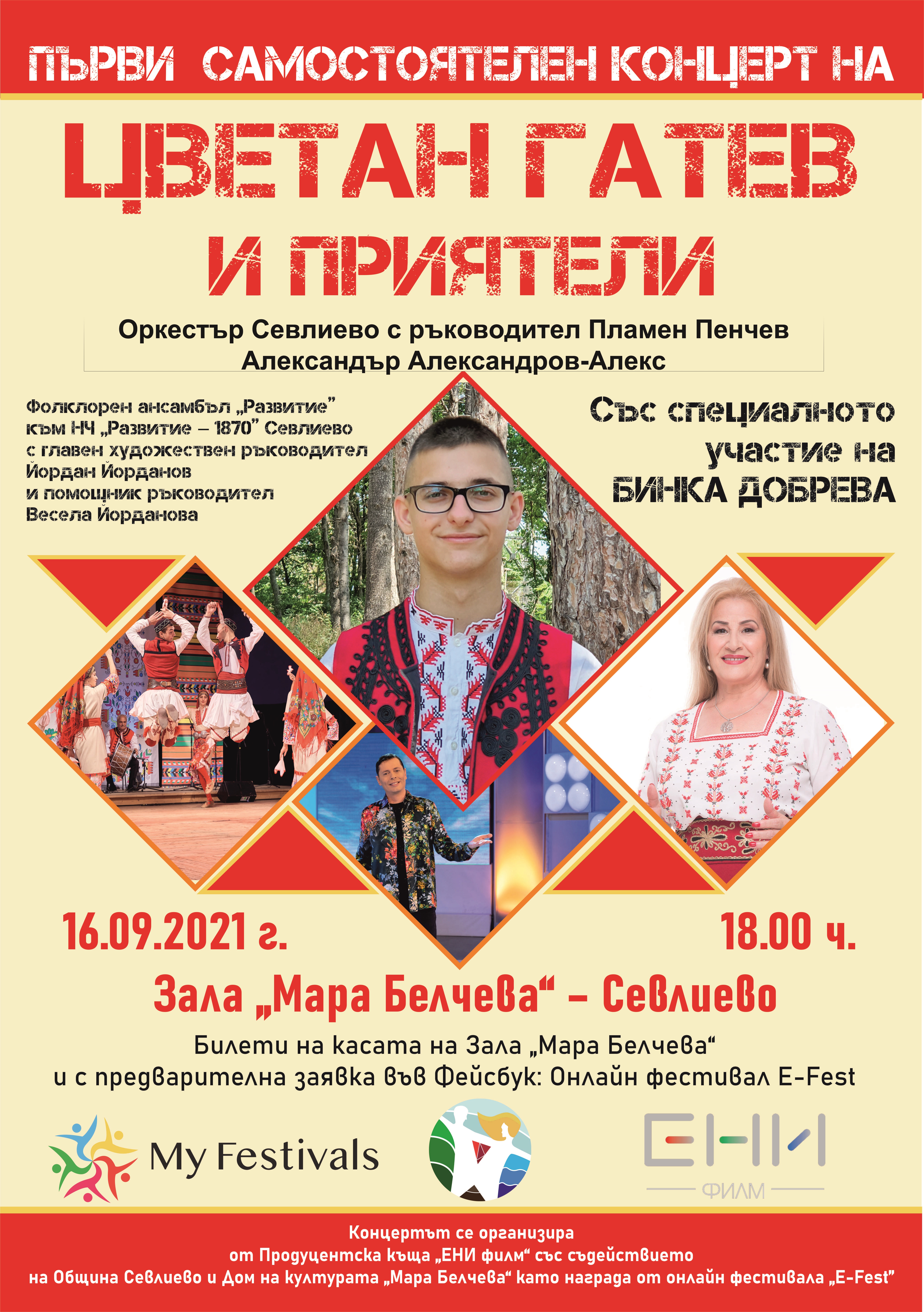 Младият талантлив изпълнител Цветан Гатев кани приятели и любители на хубавата българска музика на своя първи самостоятелен концерт. Събитието е планирано за 16 септември от 18 ч. в Дом на културата „Мала Белчева“ в Севлиево. На сцената заедно с Цветан ще се качат голямата българска певица Бинка Добрева, популярният изпълнител и телевизионен водещ Александър Александър-Алекс, Оркестър Севлиево с ръководител Пламен Пенчев и танцов Ансамбъл „Развитие“ към НЧ „Развитие-1870“ с художествен ръководител Йордан Йорданов и помощник ръководител Весела Йорданова. Концертът се организира от Продуцентска къща „ЕНИ филм“ със съдействието на Община Севлиево и Дом на културата „Мара Белчева“.