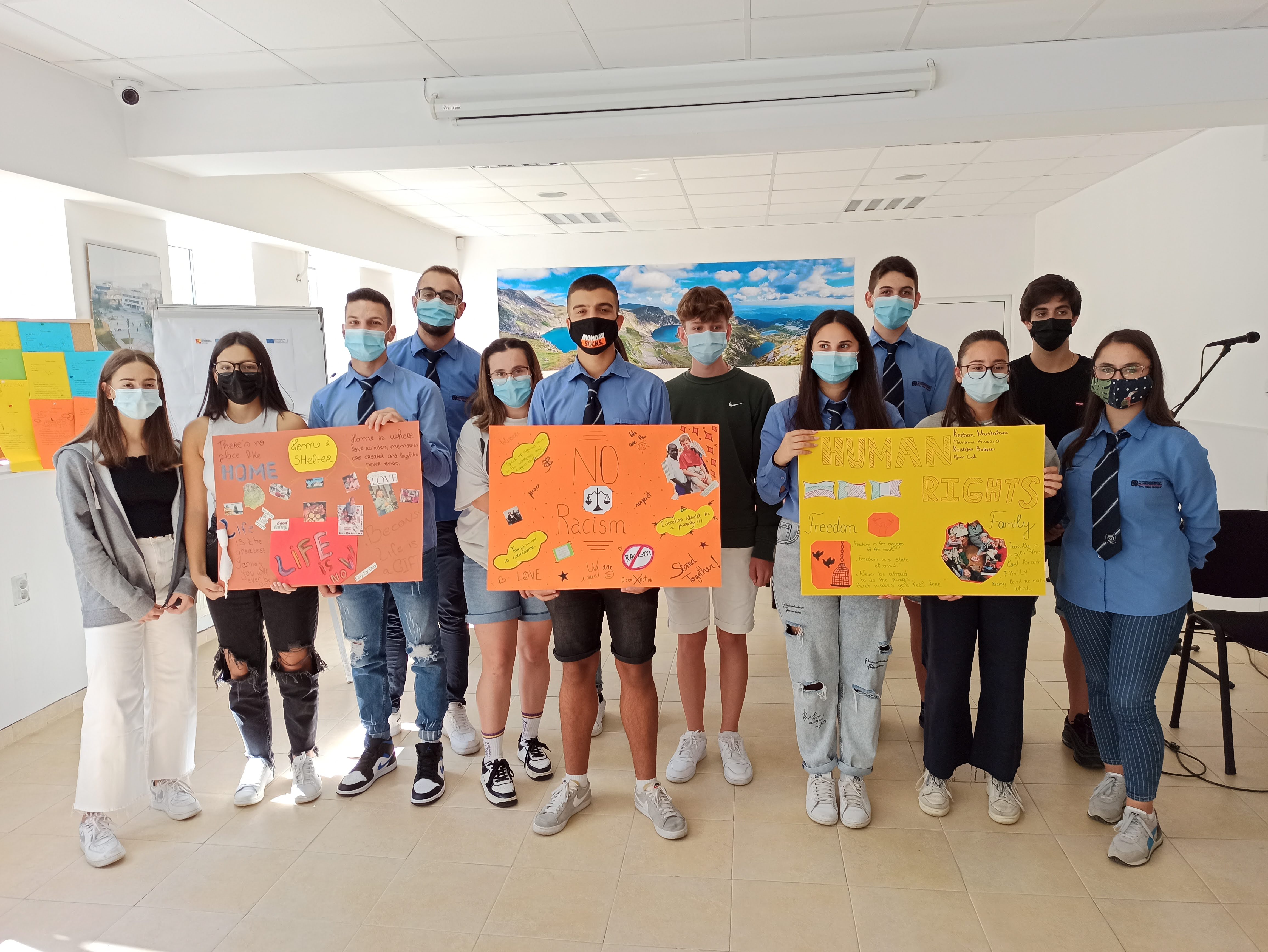 Темата на ученическата работилница бе „Човешките права“. След запознаване на участниците, отговаряйки на въпроси за хобита, мечти и страхове, учениците бяха разделени на групи и изготвиха постери за избрани от тях човешки права. Насладиха се на музикални поздрави и танци на живо и онлайн, а италианските ученици се представиха от езиковия кабинет на тяхното училище чрез интернет връзка.