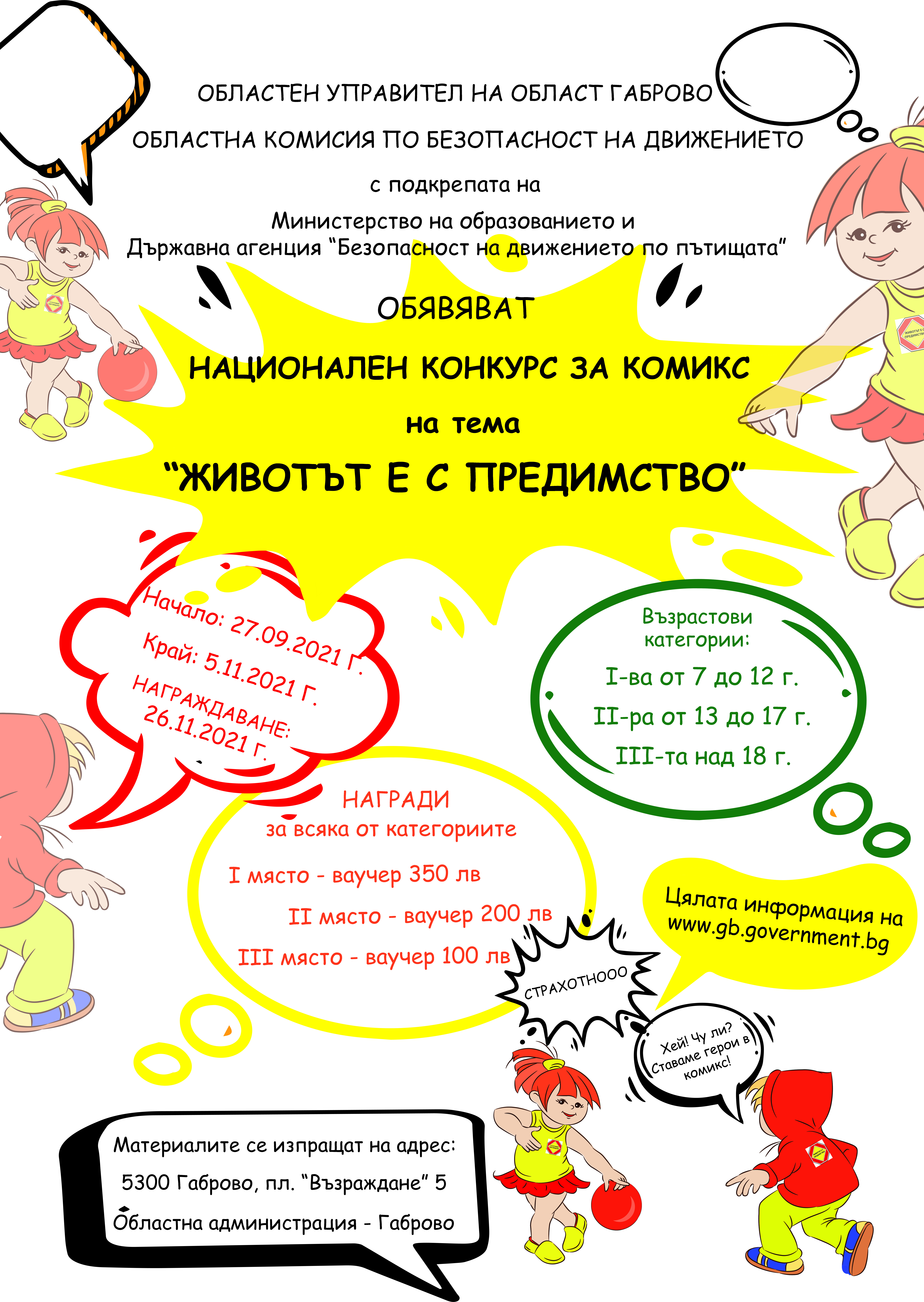 Областна администрация – Габрово и Областната комисията по безопасност на движението по пътищата обявиха национален конкурс за комикс на тема „Животът е с предимство“ с подкрепата на Министерство на образованието и науката и Държавна агенция „Безопасност на движението по пътищата“. Конкурсът е продължение на кампанията за пътна безопасност, която администрацията заедно с общините и бизнеса от региона реализира с поставяне на макети на деца, имитиращи рисково пресичане на пешеходни пътеки.