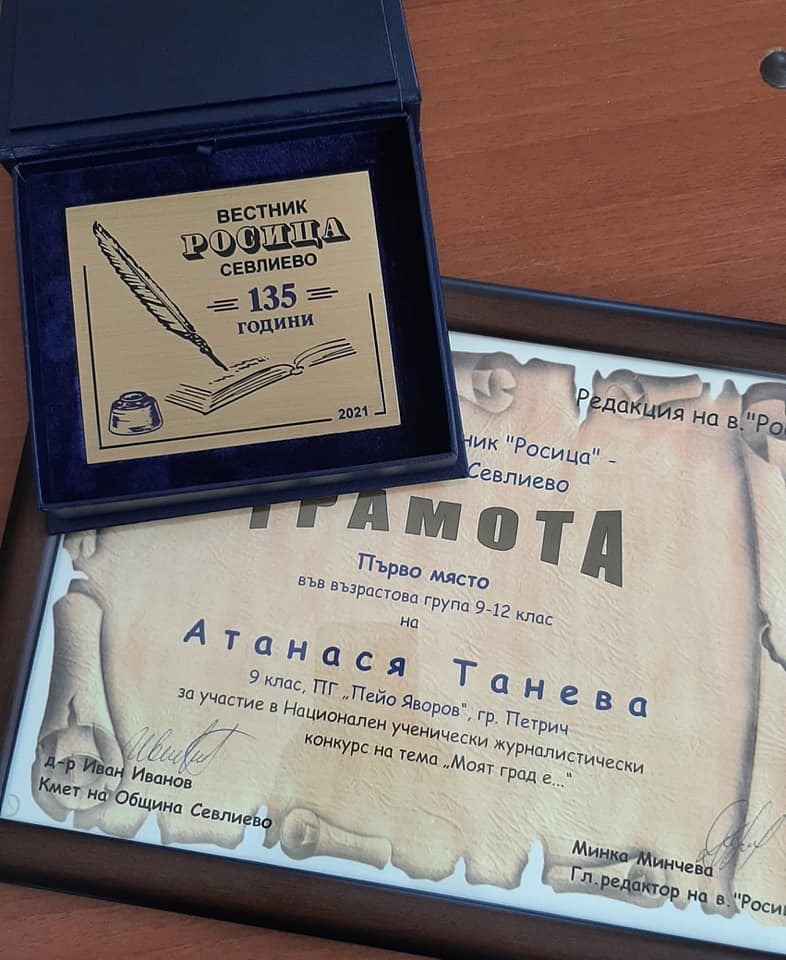 Благодарим Ви за високото отличие! Щастливи сме, че наша ученичка е победител във Вашия конкурс!