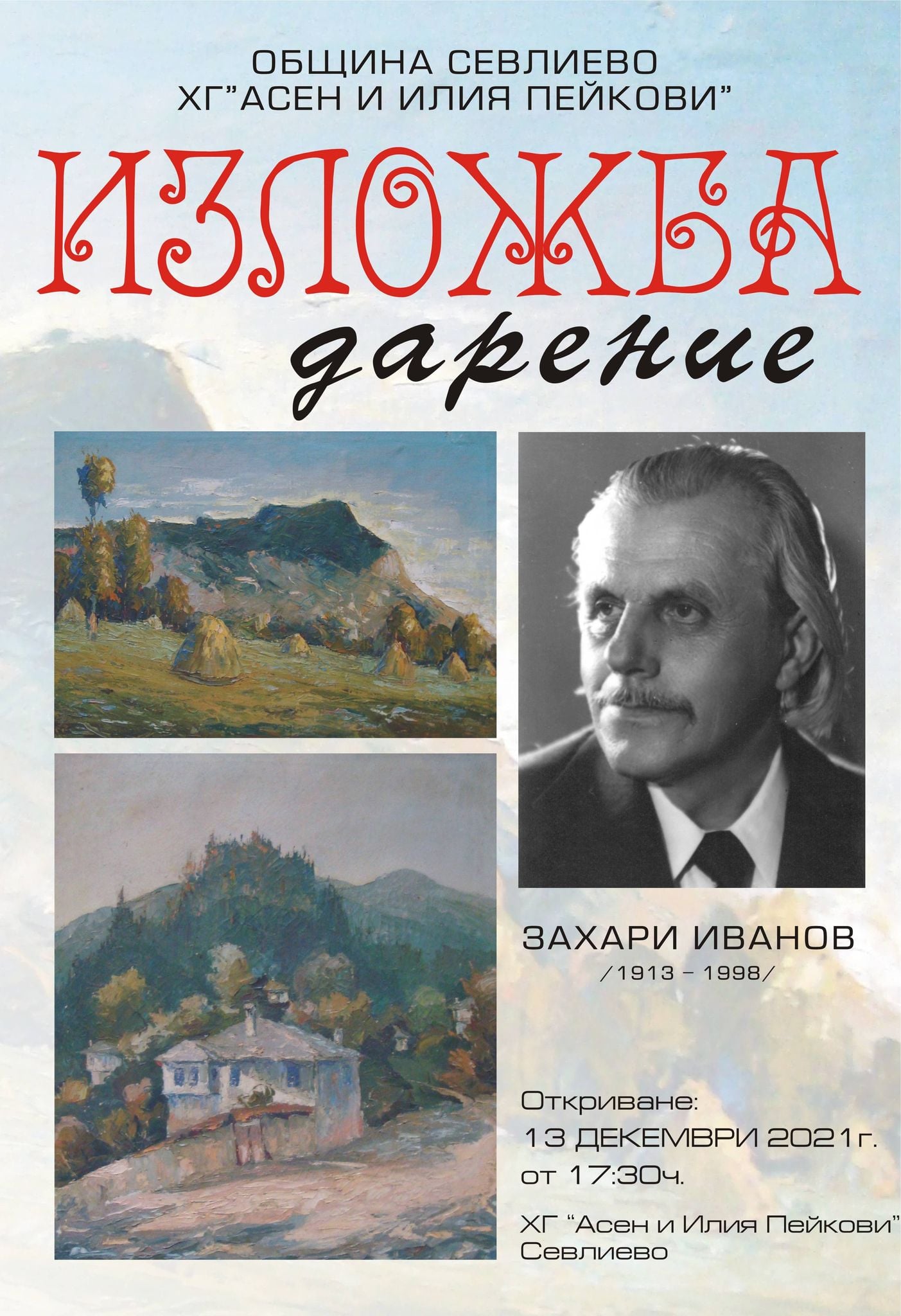 Тази вечер, точно в 17:30 часа, в градската художествена галерия „Асен и Илия Пейкови“ ще бъде отрита специална изложба-дарение. Ценителите на изобразителното изкуство ще могат да разгледат 30 платна на художника Захари Иванов, дарени на галерията през 2019 година от дъщерята на майстора на четката Мира Захариева.