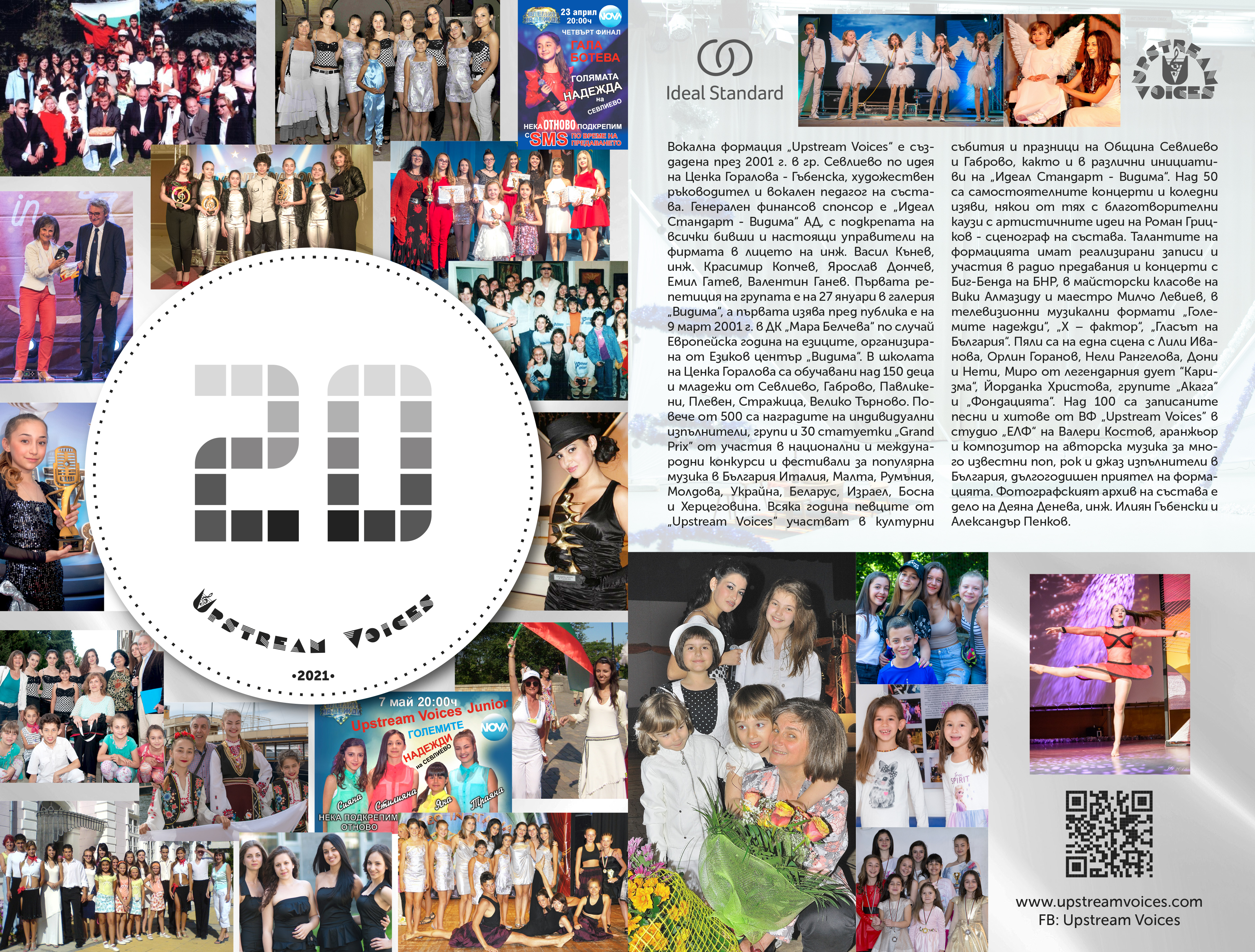 Убедена съм, че за любителите на музикалното изкуство у нас, а и в други европейски държави, вокална формация Upstream Voices е вече част от музикалната визитка на Севлиево. До този извод стигнах след многобройните информации, които сме получавали в редакцията на в.“Росица“ за участието на младите вокалисти и престижните награди от певчески конкурси у нас и в чужбина. През последните две години – 2020 и 2021 те намаляха. Естествено, при тези строги ограничителни мерки заради пандемията нямаше изяви, но какво става с формацията, с тези талантливи деца? Това беше повода да поканя на разговор г-жа Ценка Горалова, вокален педагог и ръководител на групата. Но се оказа, че разговорът е много навременен, защото вокална формация Upstream Voices през 2021 година навърши 20 години. Какъв по-хубав повод да разговаряме за музиката, която топли душата, кара те да живееш и за нея не са нужни преводачи – тя достига до сърцата на всички, които знаят нейния език. А той се учи в най-ранна възраст и не се забравя никога. В това ме увери по време на нашата среща г-жа Горалова, която е отдала живота си на музиката и най-важното – да научи децата да разбират нейния език.