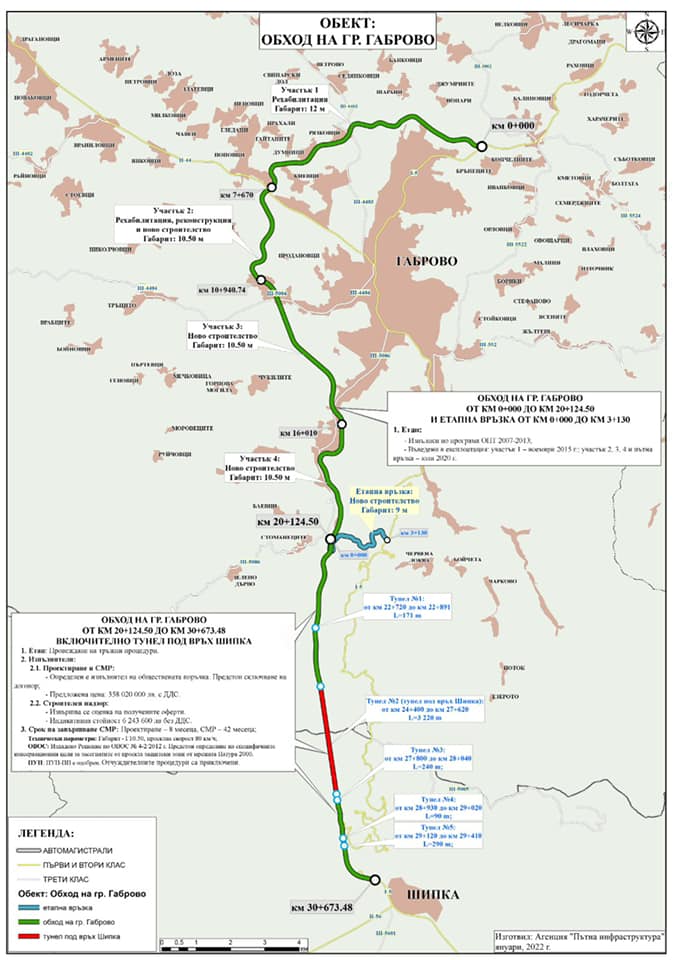 Заложеният в договорите срок за изпълнение на обхода на Габрово, включително тунел под връх Шипка, е 50 месеца – 8 месеца за проектиране и 42 месеца за строителство (общо 4 години и два месеца). „Проектът за тунел на Шипка няма бъде готов в моя мандат като министър. Но с ръка на сърцето мога да гарантирам, че всичко, което зависи от мен, ще бъде направено, за да се реализира мечтата на габровци“, отбеляза Гроздан Караджов.