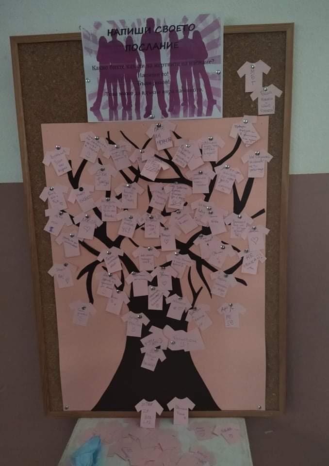 Сутринта на 23.02 учениците бяха посрещнати от двама членове на Ученическия съвет, които раздаваха стикери във формата на тениски и с надпис: “ Стоп на насилието и тормоза”. Във фоайето на първия етаж вървеше презентация с историята на деня на розовата фланелка. На втория етаж беше поставено табло, върху което ученици и учители отговаряха на въпроса “Какво бихте казали на жертва на насилие”, като споделяха своите мисли, написани върху малки листчета във формата на тениски. Отговорите бяха: “ Бъди себе си”, “Късмет”, “Без злобни погледи”, “Не обиждай”, “Потърси помощ” и много други подкрепящи изрази. Учениците от начална степен също се включиха, като написаха своите послания.