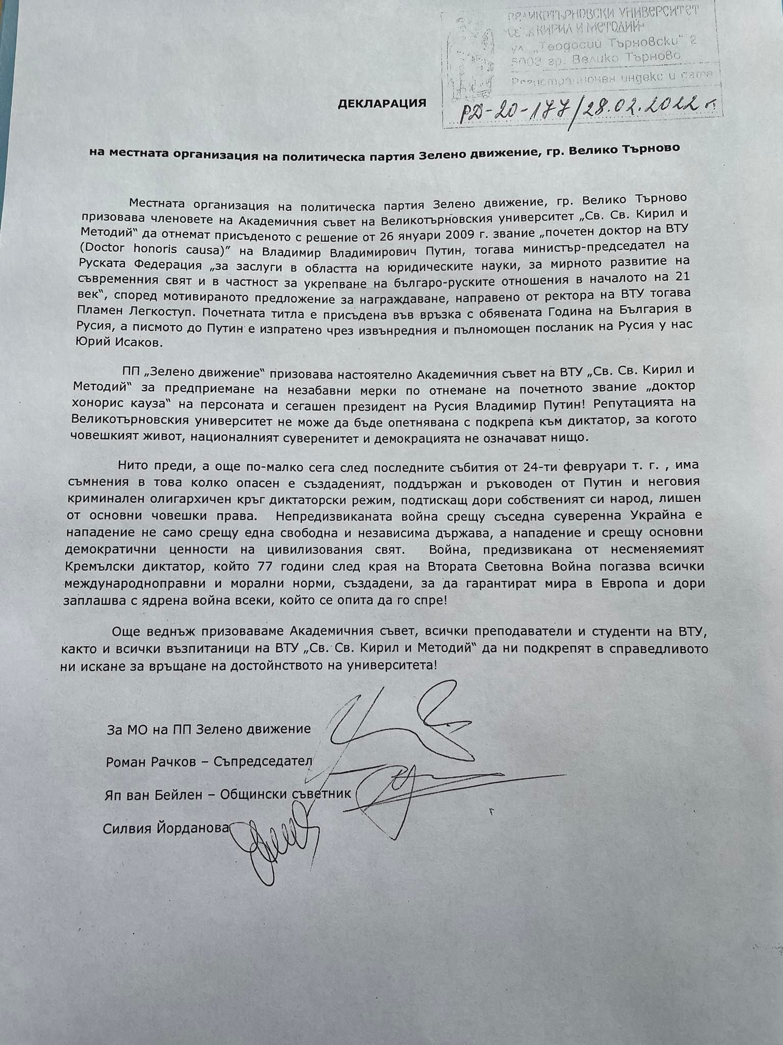 „Уважаеми г-н Ректор, предлагаме да бъдат предприети незабавни действия за отнемане на почетното звание „почетен доктор на ВТУ“ от президента на Руската федерация Владимир Путин, което му беше присъдено с Решение на АС на ВТУ от 26 януари 2009 г.
