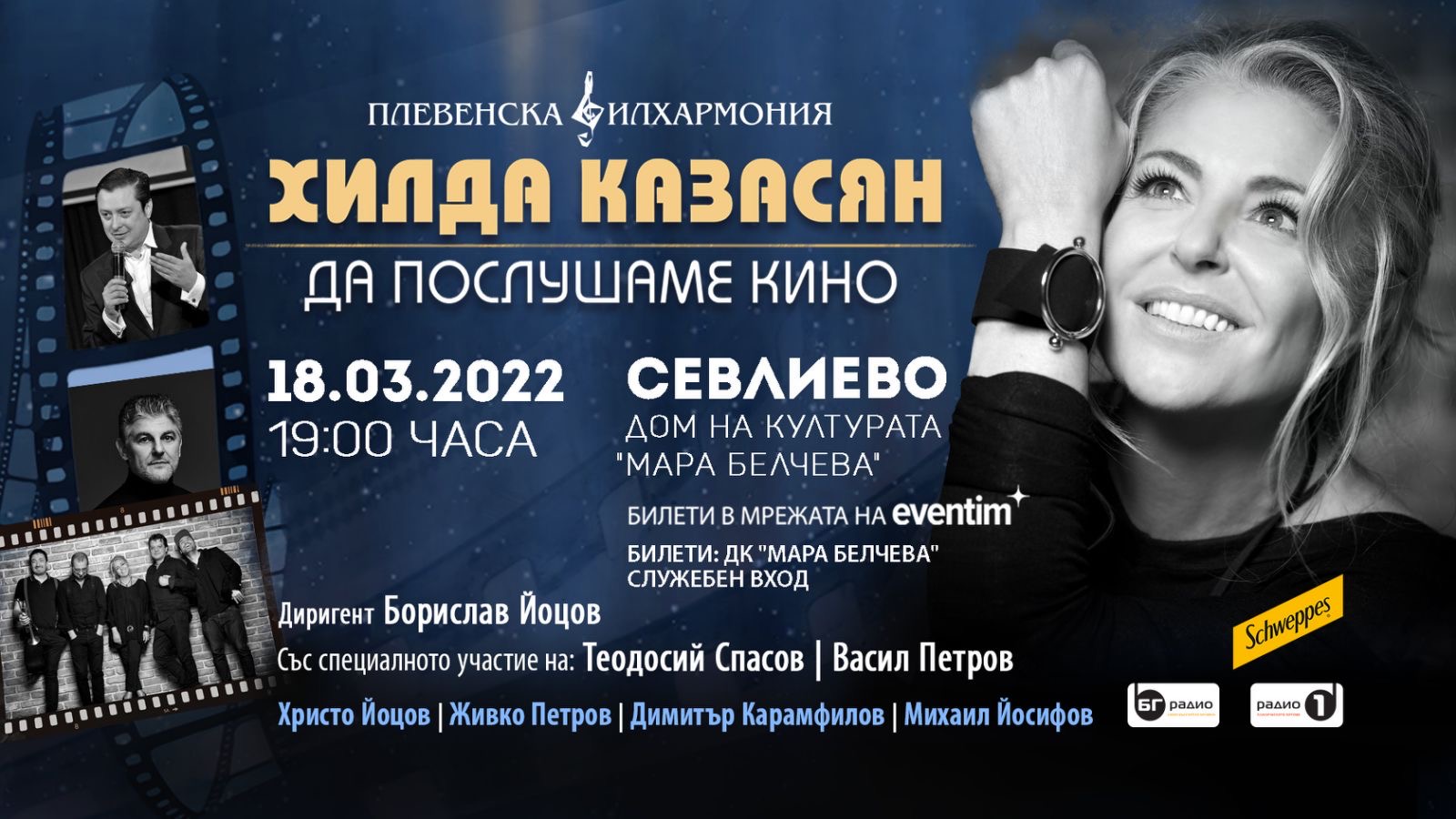 Очарователната ХИЛДА КАЗАСЯН, заедно с фантастичните музиканти от Плевенска филхармония идват в СЕВЛИЕВО на 18 март, за да ни потопят в света на вълшебната БЪЛГАРСКА ФИЛМОВА МУЗИКА от любимите ленти.