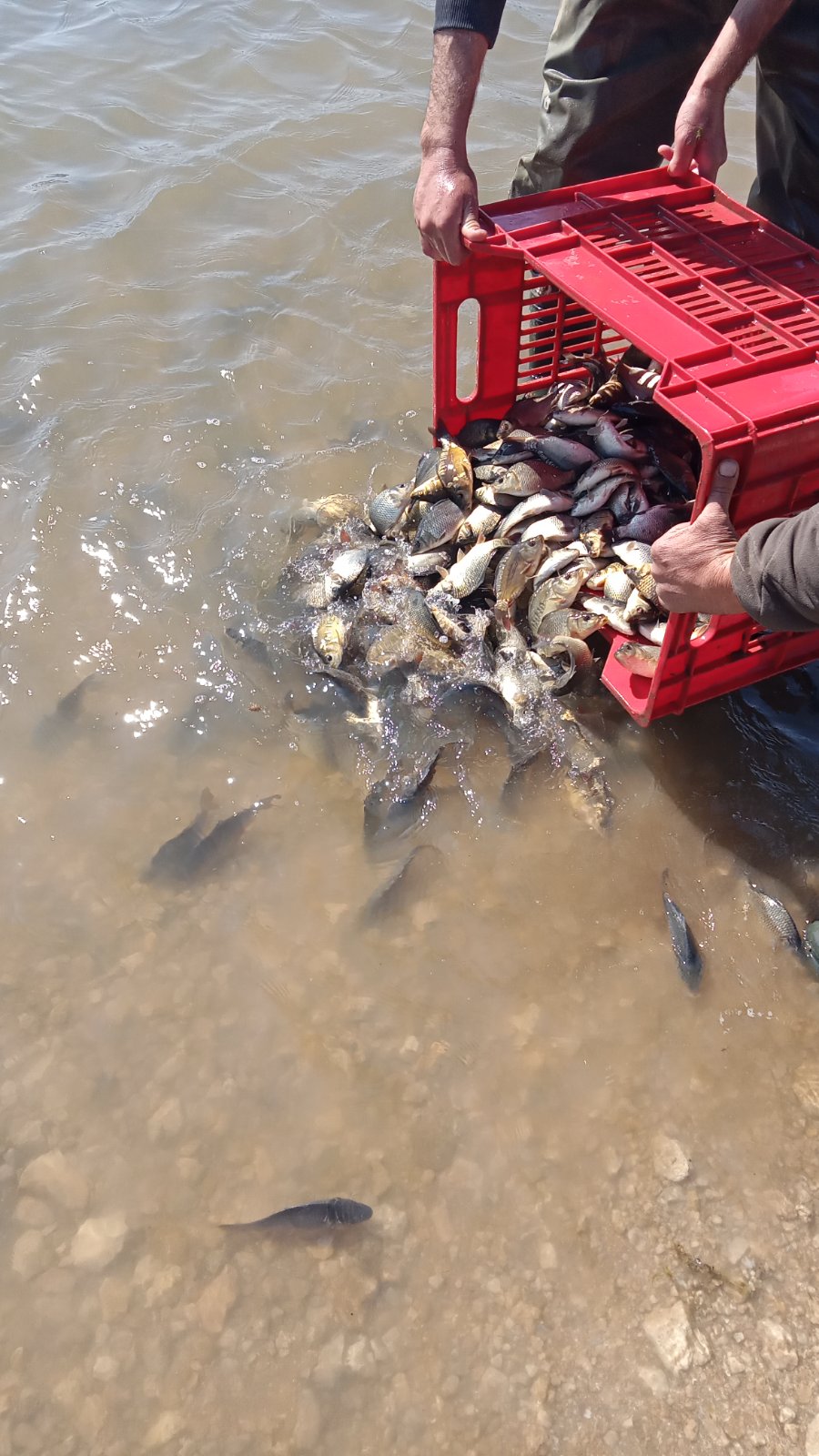Сега във водите на водоема вече плуват 13 000 едногодишни шаранчета с тегло приблизително 100 гр.