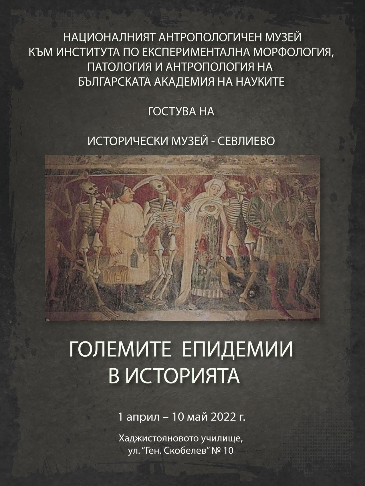 “Големите епидемии в историята“ е името на експонираната изложба в Хаджистояновото училище, която ще бъде открита на 1 април. С нея, за първи път, в Севлиево гостува Националният антропологичен музей към Института по експериментална морфология, патология и антропология към БАН.
