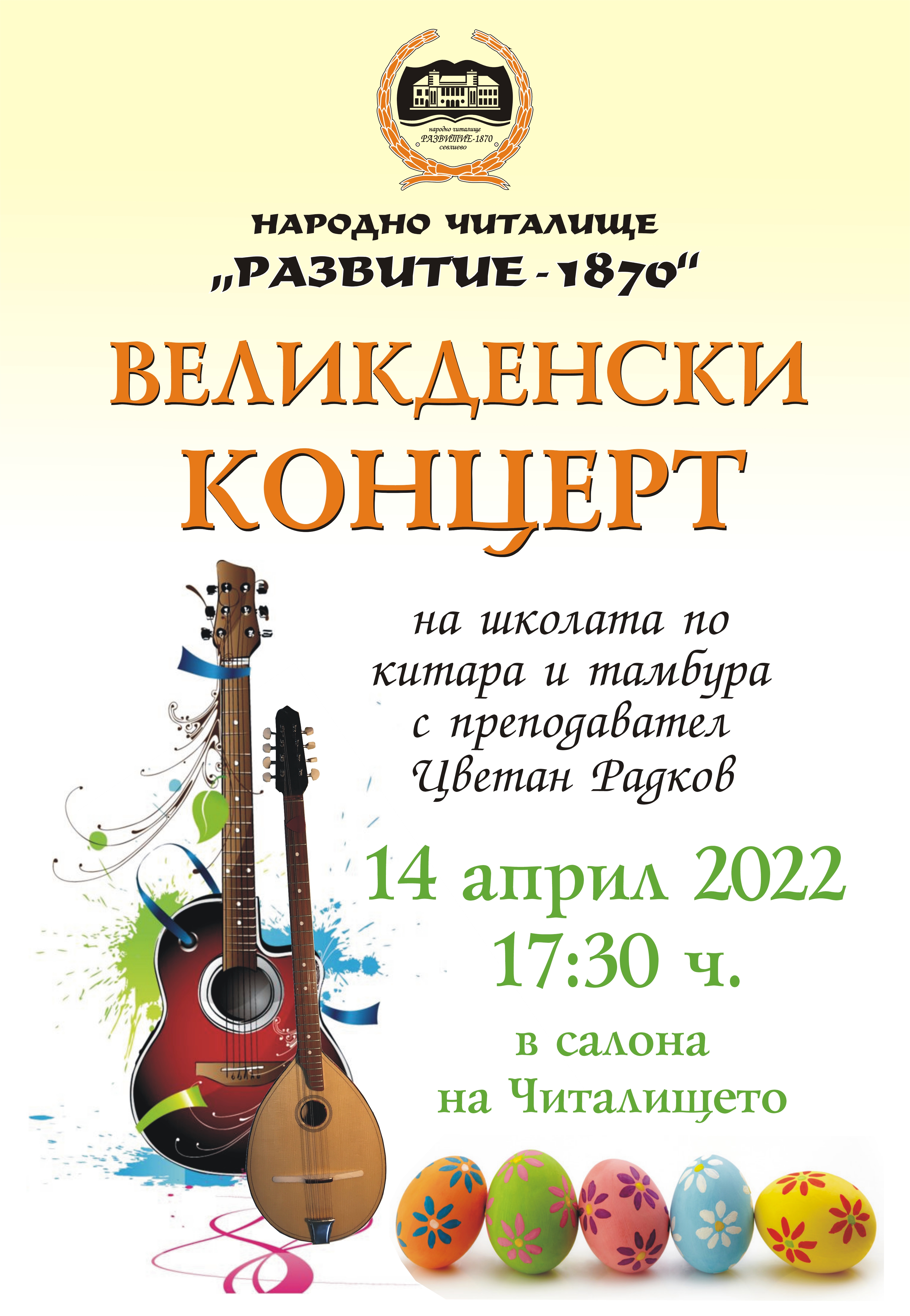 Школата по китара и тамбура при Народно читалище „Развитие-187О”, с преподавател Цветан Радков, ще зарадва севлиевци с празничен концерт по повод светлия християнски празник Великден. Заповядайте на 14 април от 17:3О часа в салона на културната институция. Входът е свободен!