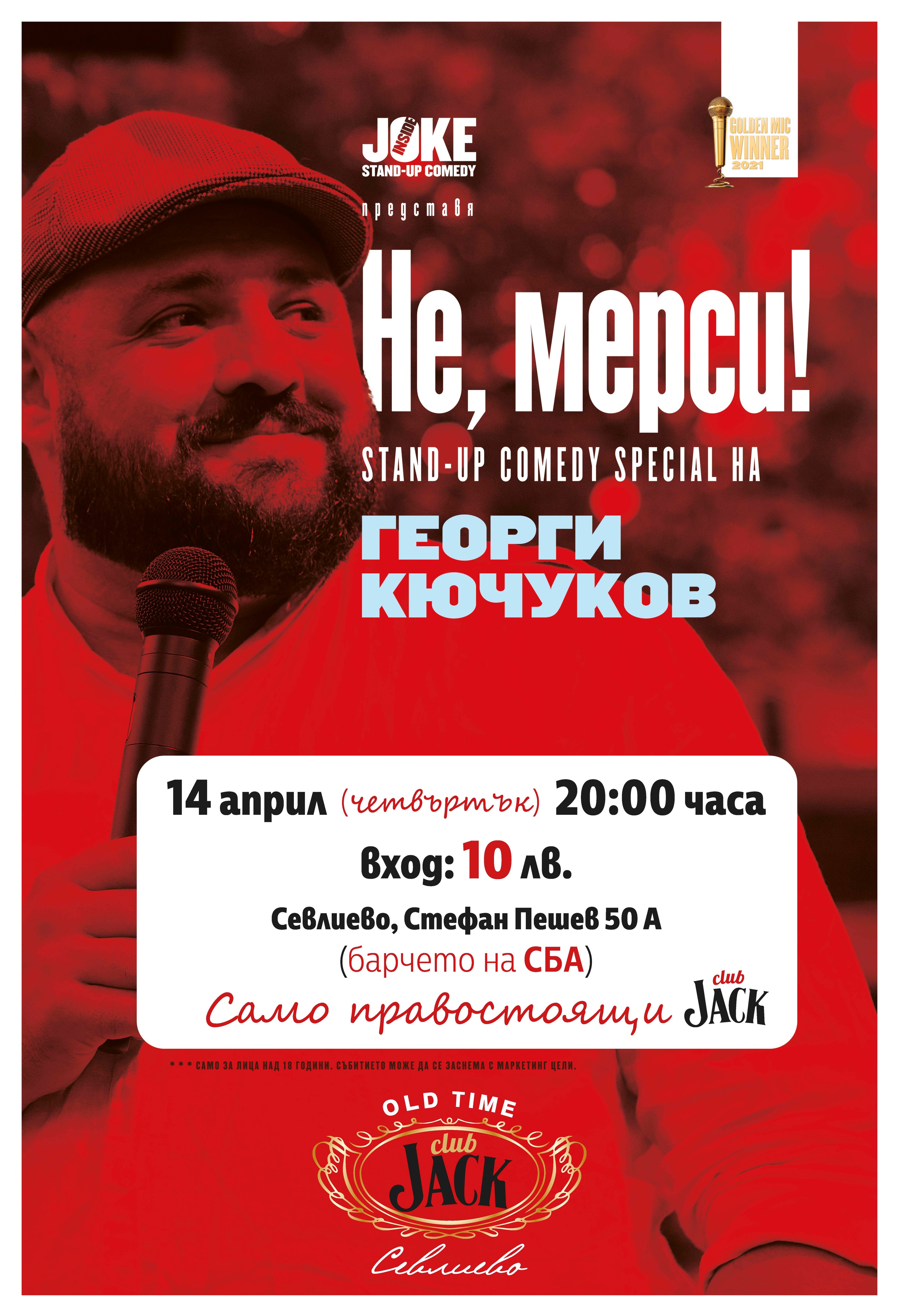 По традиция премиерата се пада на централния нападател Георги Кючуков, сочен още за „кмет на стендъпа в България“, той е носител на наградата „Golden Mic 2021“ за най-добър комедиант! Шоуто му „Не, мерси!“ е винаги разпродадено, а публиката винаги иска още. Не пропускайте едно уникално събитие на живо в град Севлиево, само на 14 Април в Club Jack!
