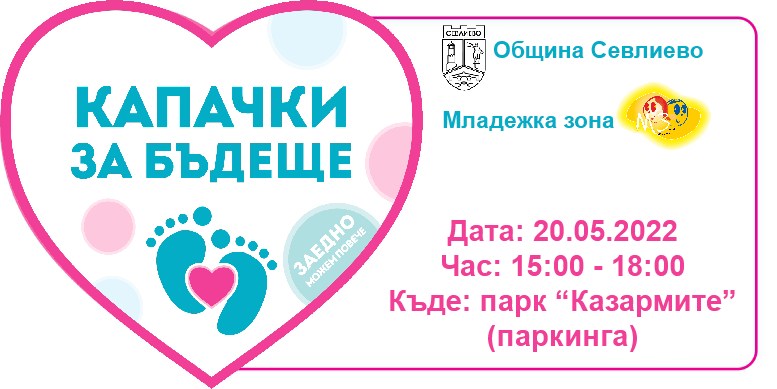 Община Севлиево и доброволците от Младежка зона канят всички заинтересовани жители на града да се включат в поредната кампания „Капачки за бъдеще“. Тя ще се проведе този петък – 20 май, от 15:00 до 18:00 часа, в парк „Казармите“.