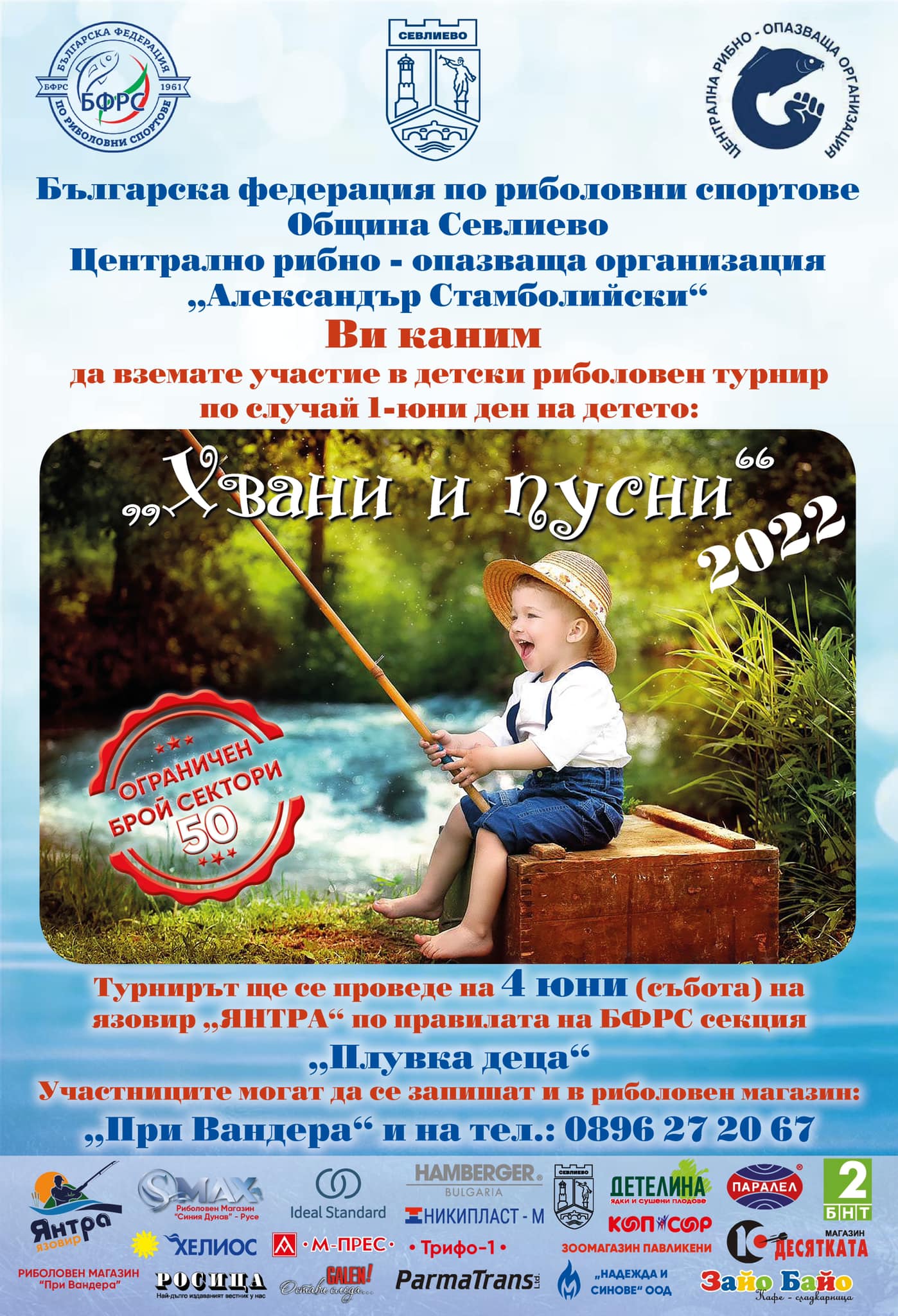 Българска федерация по риболовни спортове, Община Севлиево и Централна рибно-oпазваща oрганизация „Александър Стамболийски“ канят всички малчугани да участват в детския риболовен турнир по случай 1-ви юни – „Хвани и пусни“. Турнирът ще се проведе на 4 юни (събота) на яз. „Янтра“.