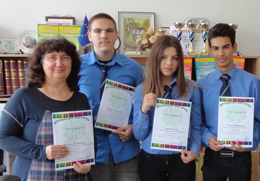 Старши учителят по биология и химия Красимира Томева получи трета награда за създадената „Малка книжка за големия гений“ и проведените различни активности, с които училището отбеляза 150-ата годишнина от рождението на великата Мария Кюри. „Чрез участието си в конкурса, учениците изразиха желание да се запознаят по-отблизо с живота и дейността на една от най-забележителните жени в науката. Защото всеки, който се е докосвал до биографията на Мария Кюри, е бил повлияван от обаянието на невероятната й личност. Нейната мисъл: „Животът не е лесен за нито един от нас. Но какво от това? Трябва да вярваме, че сме надарени с нещо и че това нещо на всяка цена трябва да бъде постигнато“, е ярко послание, което носи заряд за дейност, така необходим днес на младите хора“, сподели учителката Красимира Томева.