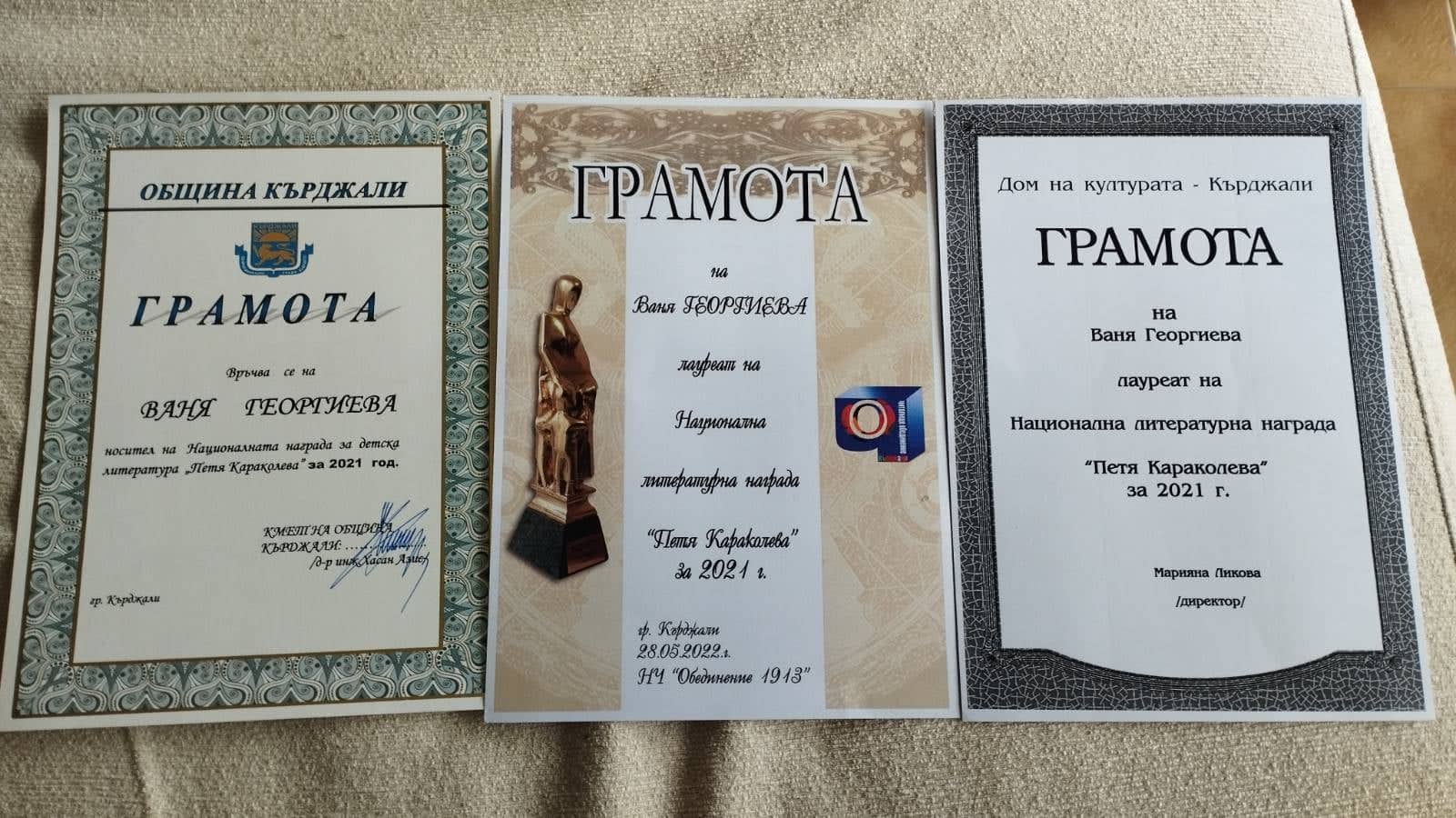Севлиевската поетеса Ваня Георгиева получи престижната Национална награда за детска литература „Петя Караколева”. Тя й бе присъдена за стихосбирката й „Есенни търкулки“, която бе определена за най-добрата детска книга за 2021 г. Традиционно наградата се връчва през октомври, но заради пандемията нейният 18-и носител – Ваня Георгиева, я получи едва сега, на 28 май – рождения ден на Петя Караколева, в Кърджали. Организатор е събитието е НЧ „Обединение – 1913” със съдействието на Творчески архив „Петя Караколева“, а съучредители на наградата са Съюзът на българските писатели и Община Кърджали.