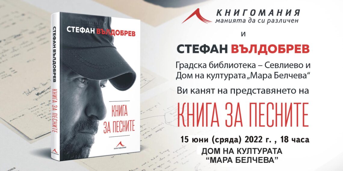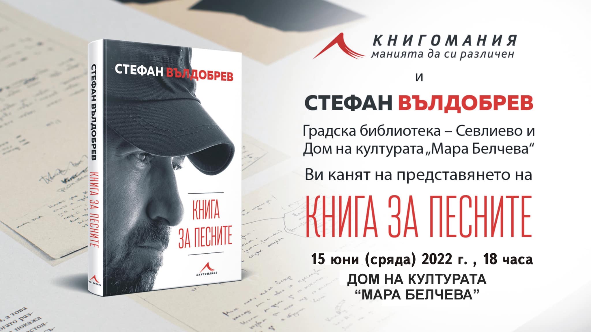 Популярния певец Стефан Вълдобрев идва в Севлиево, за да представи книгата си „Книга за песните“. Това ще стане на 15 юни (сряда), от 18:00 ч. в парка пред дома на културата „Мара Белчева“.
