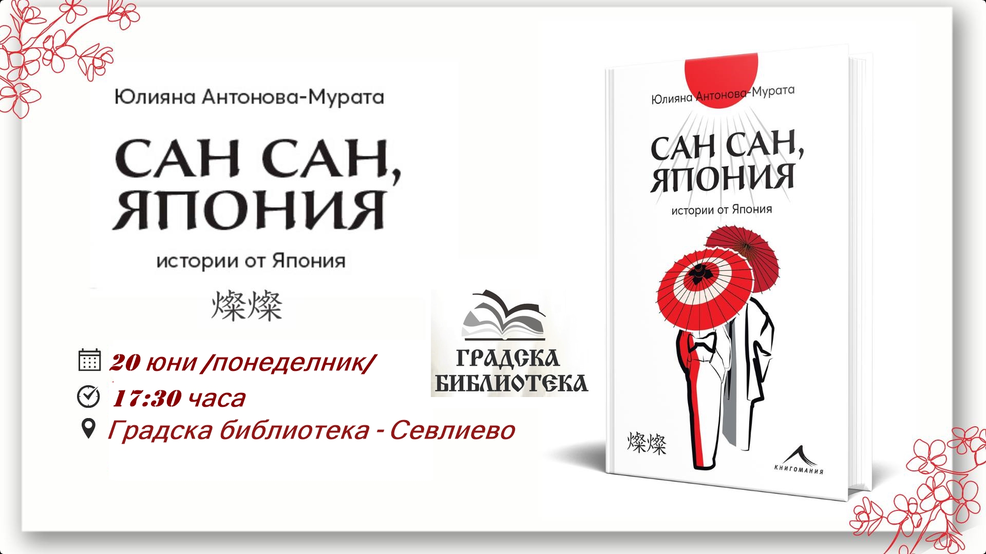 Kнигата „Сан сан, Япония“ от Юлияна Антонова-Мурата ще бъде официално представена на 20 юни (понеделник), от 17:30 ч., в Градска библиотека – Севлиево. Входът за всички ценители на писаното слово е свободен.