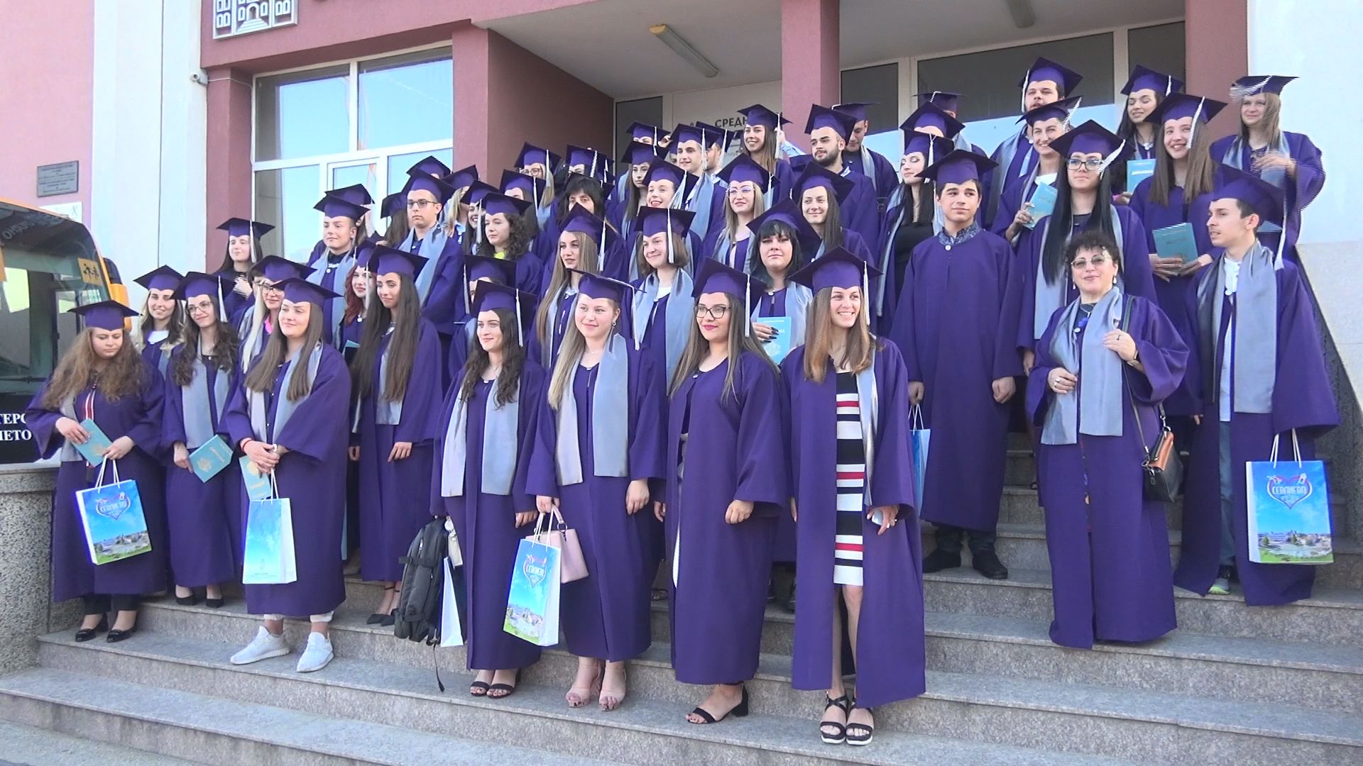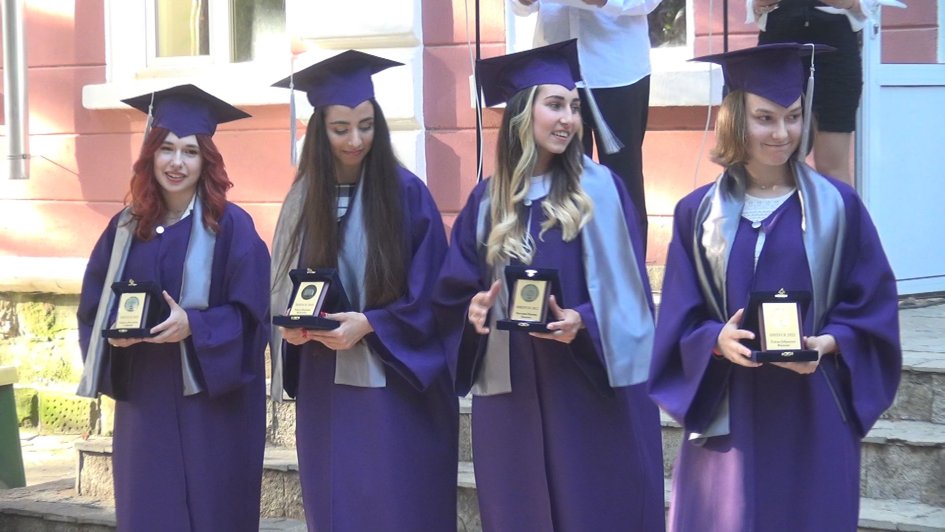 В сряда своите дипломи получиха 52-ма зрелостници, а петима – удостоверения за втори гимназиален етап. 43-ма получиха приложение на дипломата си на английски език, а един – на немски. За първа година те се явиха на Държавен зрелостен изпит по информатика, информационни технологии и предприемачество. От този випуск имаше само една пълна шестица на матурата по английски език, ниво B 1.1, и тя е на Йоана Цонева от 12 „б“ клас. Отличните дипломи, като среден успех, са 22 на брой, от обучението в 11 и 12 клас. Тази статистика бе изнесена от зам.-директорът г-жа Теодора Конова. „Три момичета от този випуск бяха част от Ученически съвет – Елица Иванова, Рада Николова и Сибел Абазва. Този випуск е богат и с много самодейци, актьори, певци, танцови изпълнители. Благодарим ви, че бяхте част от нашето училище“, каза тя.