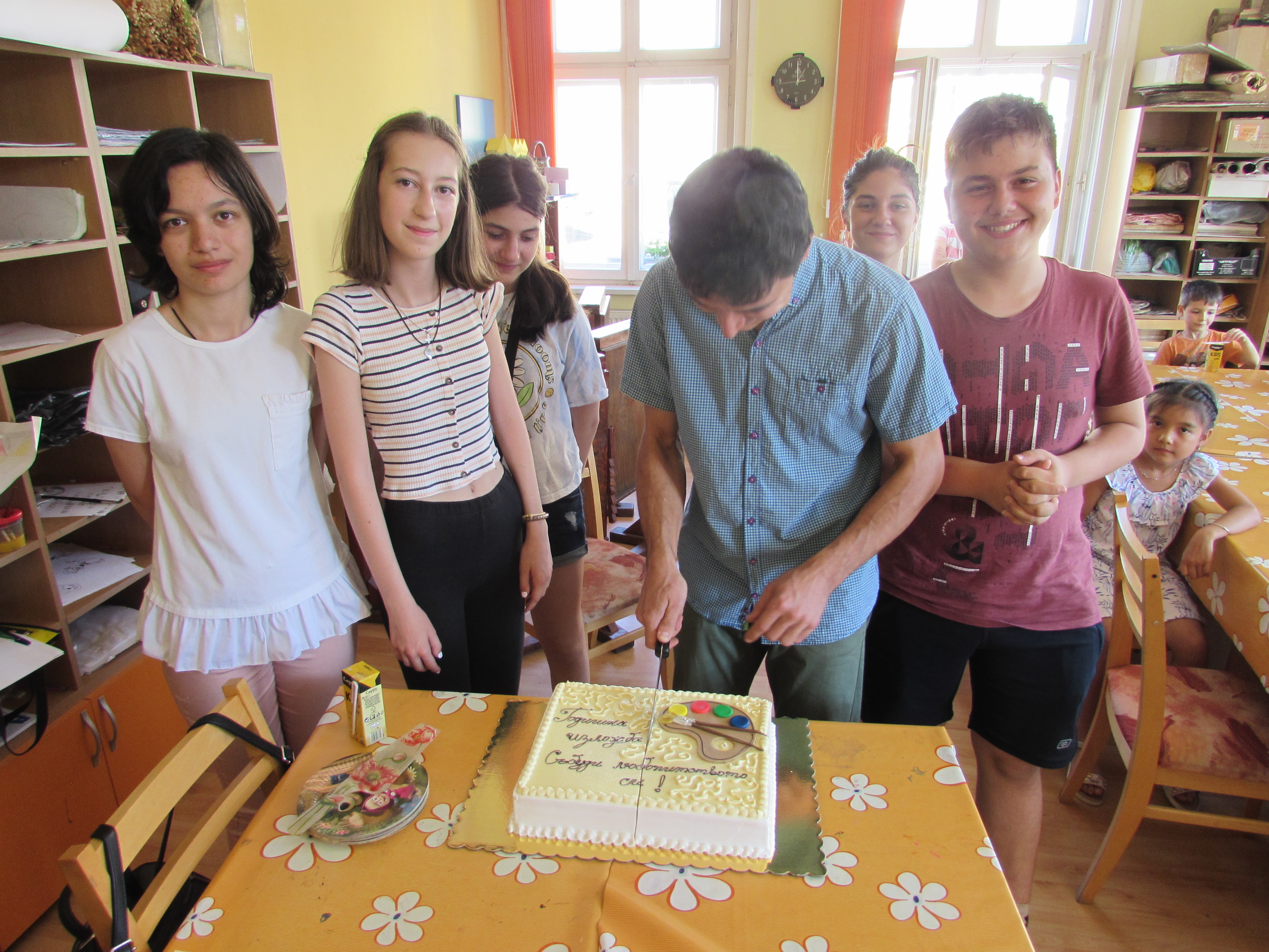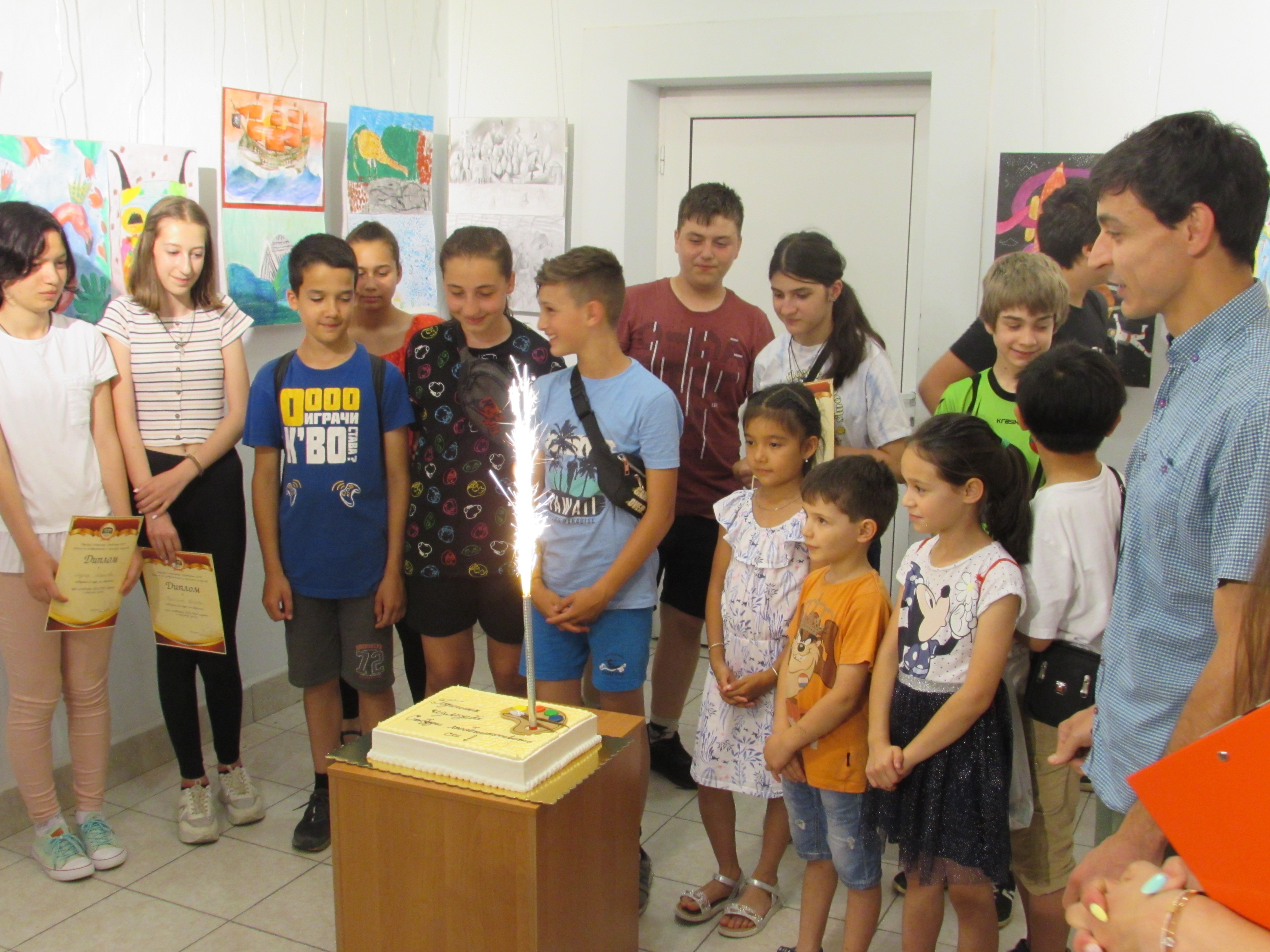 Комплимент за прекрасната годишна изложба от Настоятелството на НЧ „Развитие-1870” бяха тематичната вкусна торта и подаръчен ваучер на стойност 200 лв. за закупуването на бяла дъска за рисуване. Дипломи за отлично завършен курс на обучение получиха петима от художниците – Андрея Маринова, Елена Велешка, Мартина Велешка, Кристина Йончева и Иван Костадинов. С пожеланието за весело лято, хубави емоции, преживявания и впечатления, които на есен да претворят в рисунките си децата-творци изпратиха първия успешен творчески сезон на Школата, която пое да ръководи преди година преподавателят Велизар Захариев.