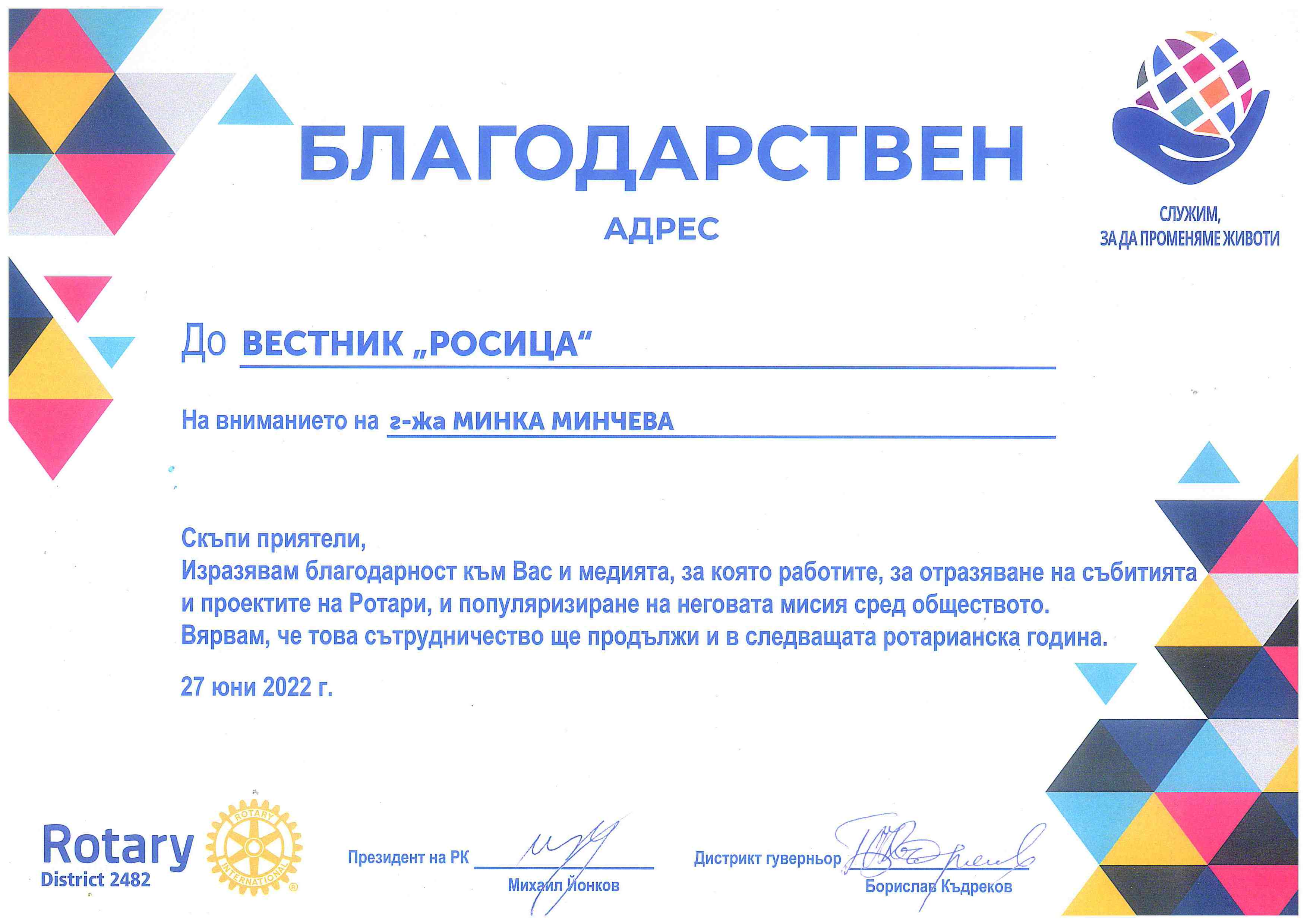 Много рядко се случва, особено през последните години, някой да благодари на медиите за добре свършена работа или за партньорство. Затова беше много приятна изненада за екипа на вестника, посещението на Михаил Йонков, миналогодишен президент на Ротари клуб – Севлиево, който връчи благодарствен адрес на в.”Росица”