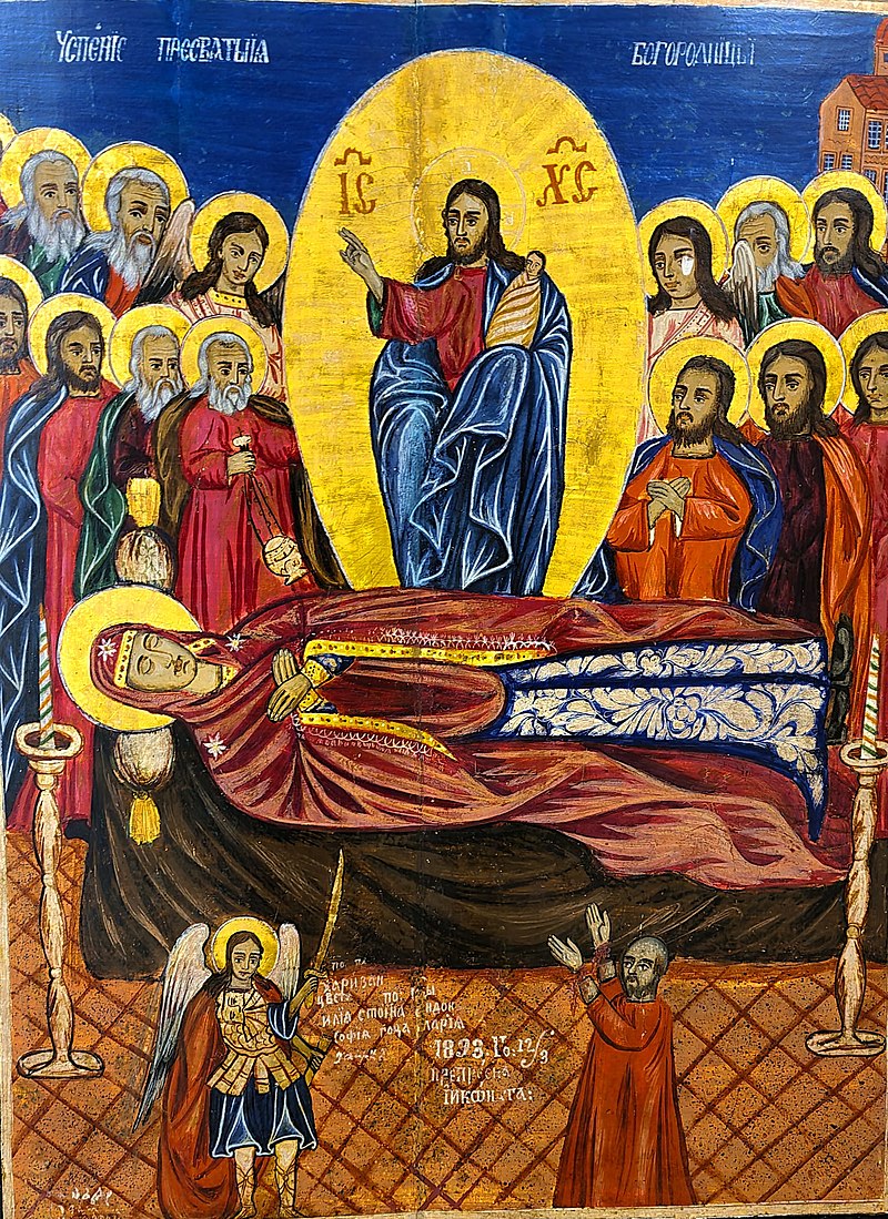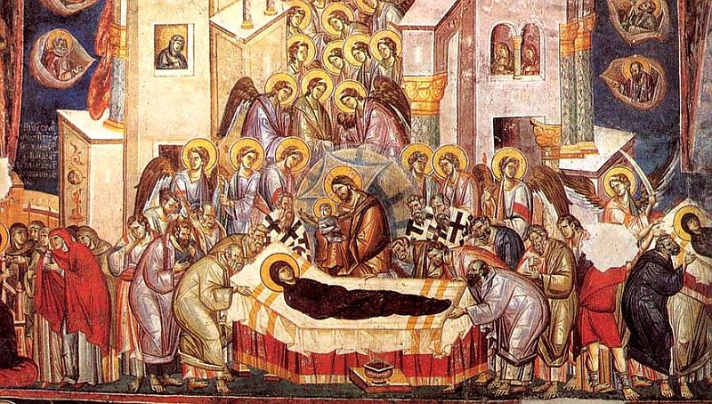 Според преданието това е денят, в който Божията майка на 64-годишна възраст напуска земния живот и отива при сина си. Три дни преди смъртта архангел Гавраил й съобщава, че Бог е пожелал да я вземе при себе си в своето царство, за да царува вечно с него. Исус обаче не е пожелал да вземе и баща си, дърводелеца Йосиф. Последното й желание е да види Светите апостоли заедно. По чуден начин те се пренасят пред вратите на дома й в Йерусалим. Три дни след това сам Иисус Христос в небесна слава, обкръжен от ангелски ликове и светци, слиза от небесата за душата на Света Богородица. Погребват я в една пещера край Гетсимания и затварят входа с камък. Когато няколко дни по-късно го отварят, за да се поклони пред светицата закъснелият апостол Тома, намират само плащеницата й. Ставайки от трапезата, апостолите чуват ангелско пеене и виждат в облаците пречистата Божия майка, обкръжена от ангели, която им казва: „Радвайте се, защото съм с вас през всичките дни.“