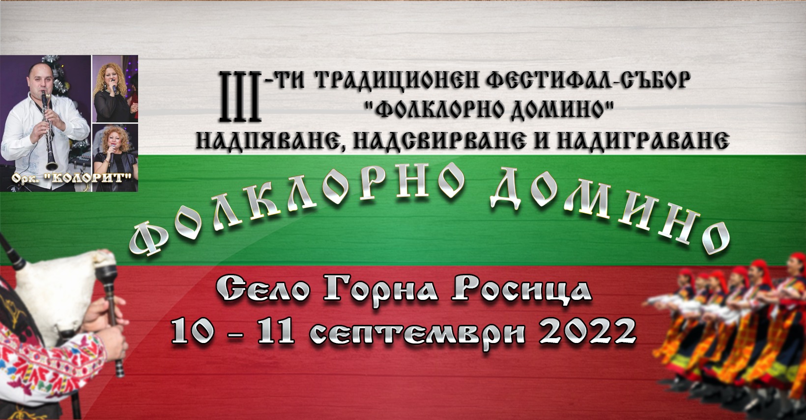 През почивните дни в село Горна Росица ще се проведе третото поред издание на фестивала „Фолклорно домино“. Организатори на музикалното събитие са Международен фестивал „Фолклорни нюанси“ и Йордан Йорданов – главен художествен ръководител на фолклорен ансамбъл „Развитие“ Севлиево, което ще се случи с любезното съдействие на Община Севлиево и НЧ „Васил Левски 1900“ с. Горна Росица и под патронажа на кмета на селото Александър Генев.