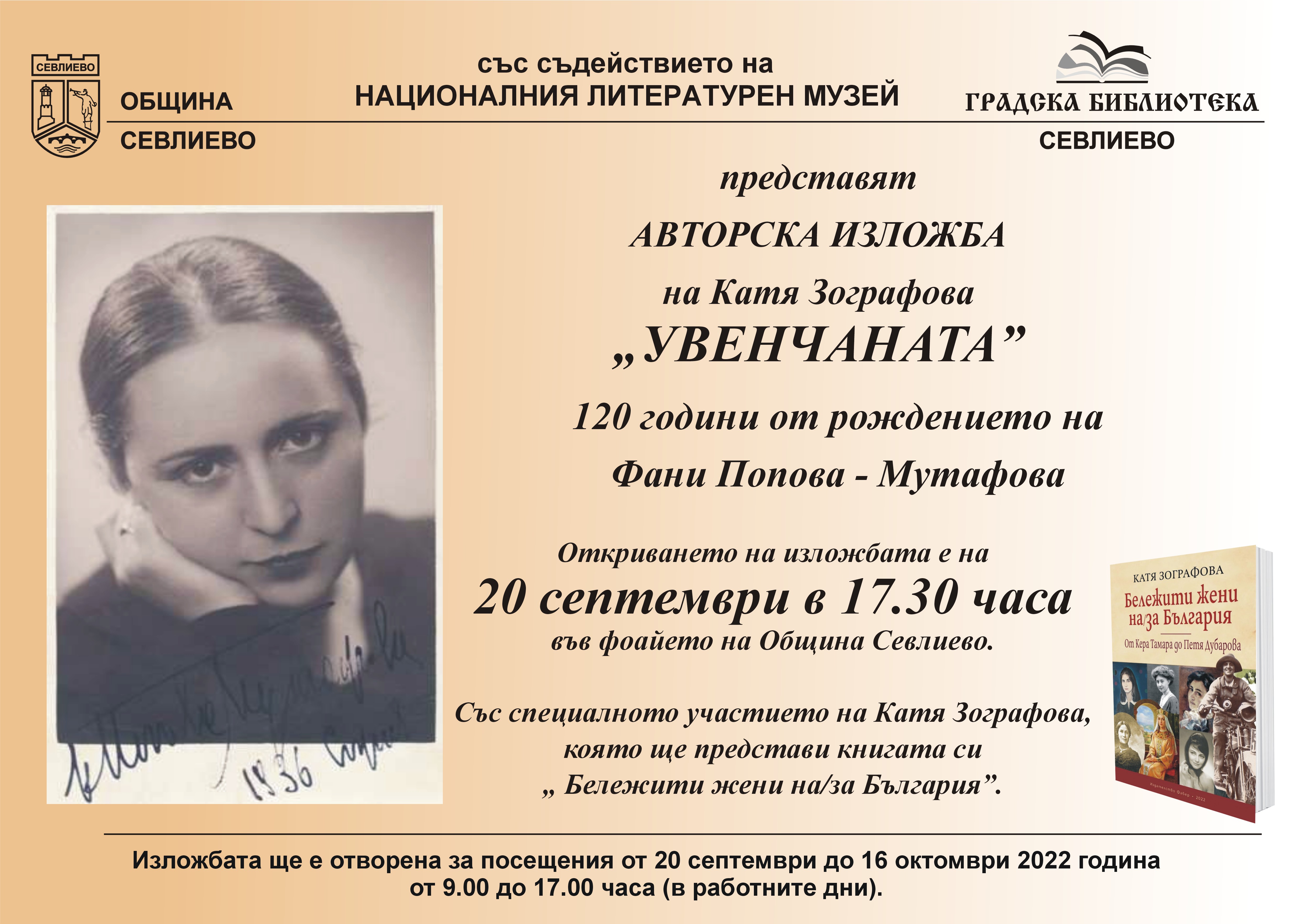 Откриване на изложба „Увенчаната” – 120 години от рождението на Фани Попова-Мутафова – в 17:30 часа във фоайето на Община Севлиево. Със специалното участието на Катя Зографова, която ще представи книгата си „Бележити жени на/за България”. Изложбата ще бъде отворена за посещения от 20 септември до 16 октомври от 9:00 до 17:00 часа, в работните дни.
