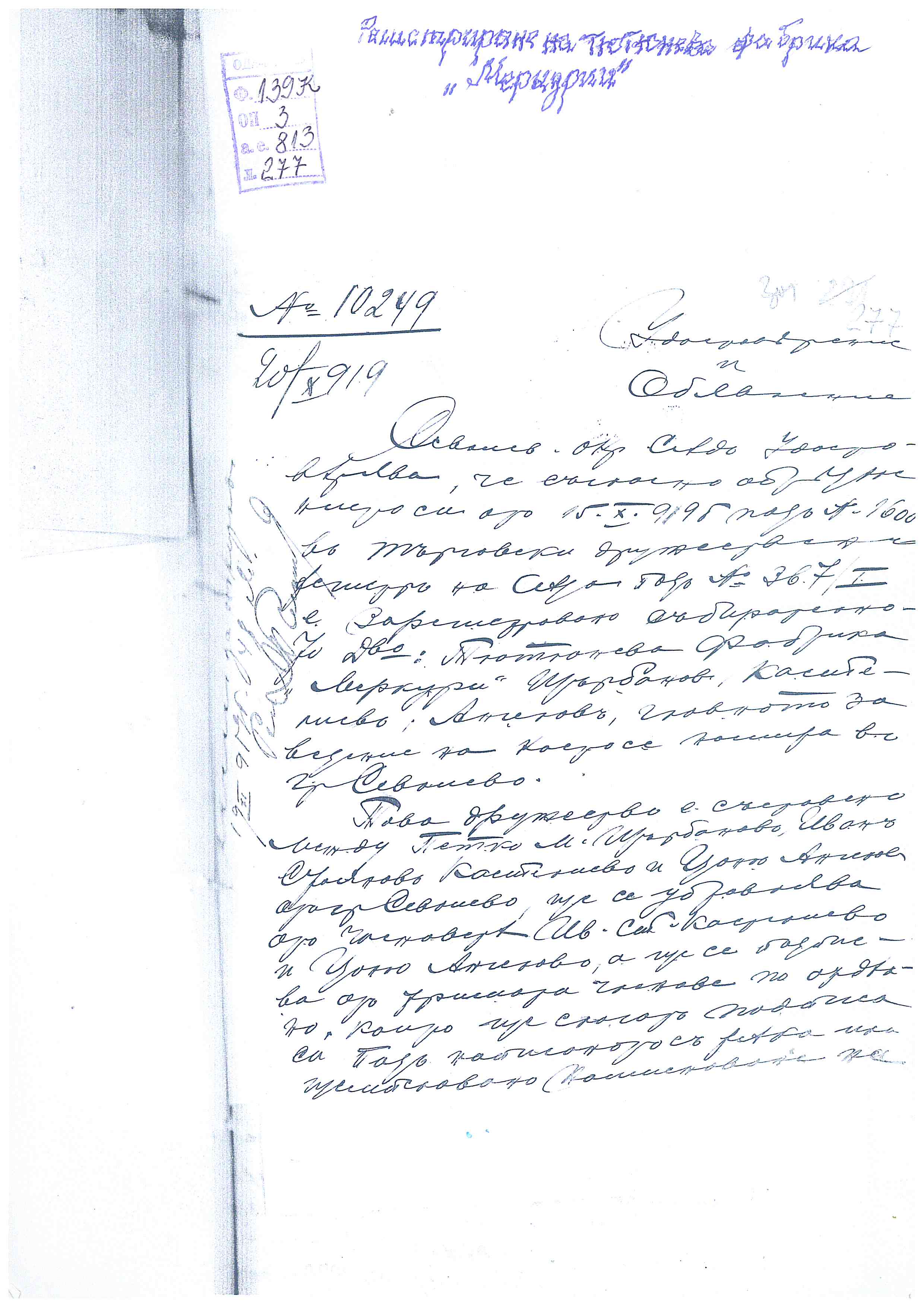 Индустриалците Петко Щърбанов, Иван Кастелиев /син на Стоян Кастелиев/ и Цоньо Ангелов регистрирали в съда индустриално дружество „Тютюнева фабрика Меркурий” и молят Общината да узакони индустриалното предприятие. Комисия посетила обекта и установила, че преустройството на сградата не е съобразено със Закона за благоустройството. Пред общинското управление протестирали и гражданите и заявили: „Ние сме против откриването на тютюневата фабрика, която ще вреди на здравето ни”. Окръжният инженер забранил откриването на тютюневата фабрика.