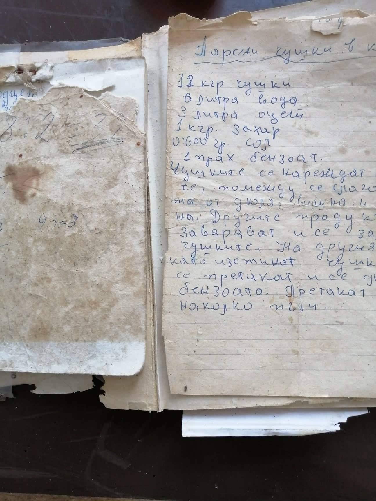 12 кг. чушки, 6 л. Вода, 3 л. оцет, 1 кг захар, 600 гр сол, 1 прах бензоат
