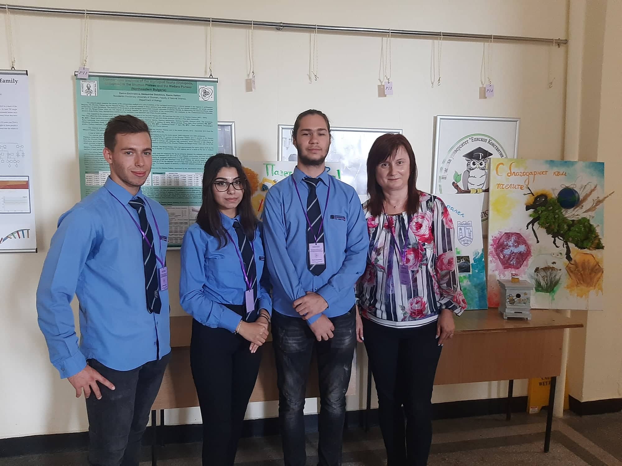 Денислава Нанкова, Радослав Спасов и Мартин Казанджиев, ученици от 11 „а“ клас, заедно с научния им ръководител Ивелина Колева, старши учител по география и икономика, участваха в постерната сесия.