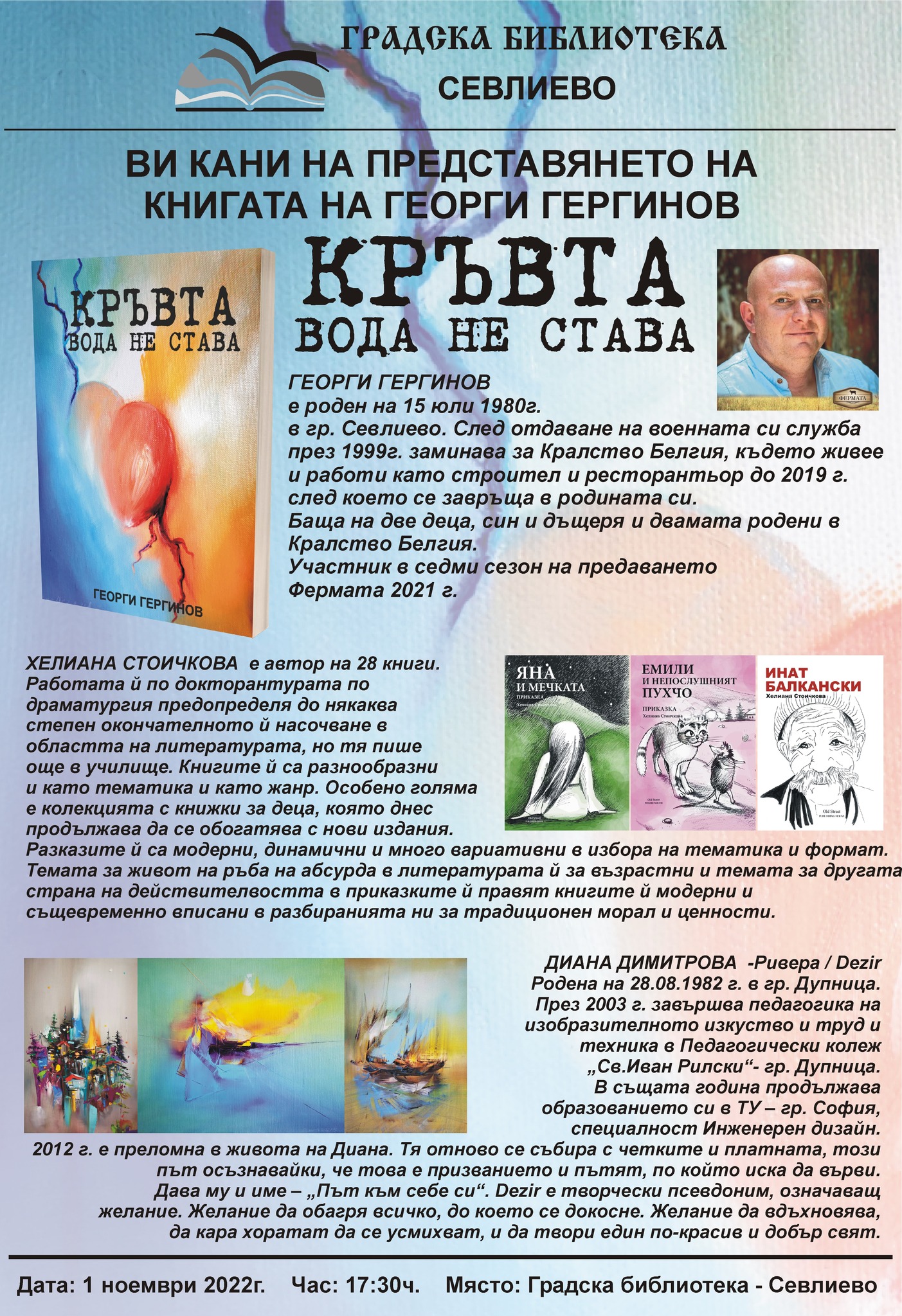 На 1-ви ноември в 17:30 часа в Залата за събития на Градска библиотека своята книга „КРЪВТА ВОДА НЕ СТАВА“ ще представи нашият съгражданин ГЕОРГИ ГЕРГИНОВ. Заедно с него ще гостува и ХЕЛИАНА СТОИЧКОВА – автор на разнообразни по жанр и тематика книги, като най-много са книжките за деца.