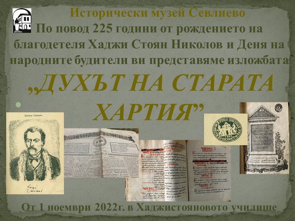 30 минути преди тържеството, в Хаджистояновото училище ще бъде открита изложба „Духът на старата хартия“, която ще покаже безценни книги от старопечатния фонд на Историческия музей по повод 225 години от рождението на Хаджи Стоян Николов. През целия ден вратите на музея ще бъдат отворени.