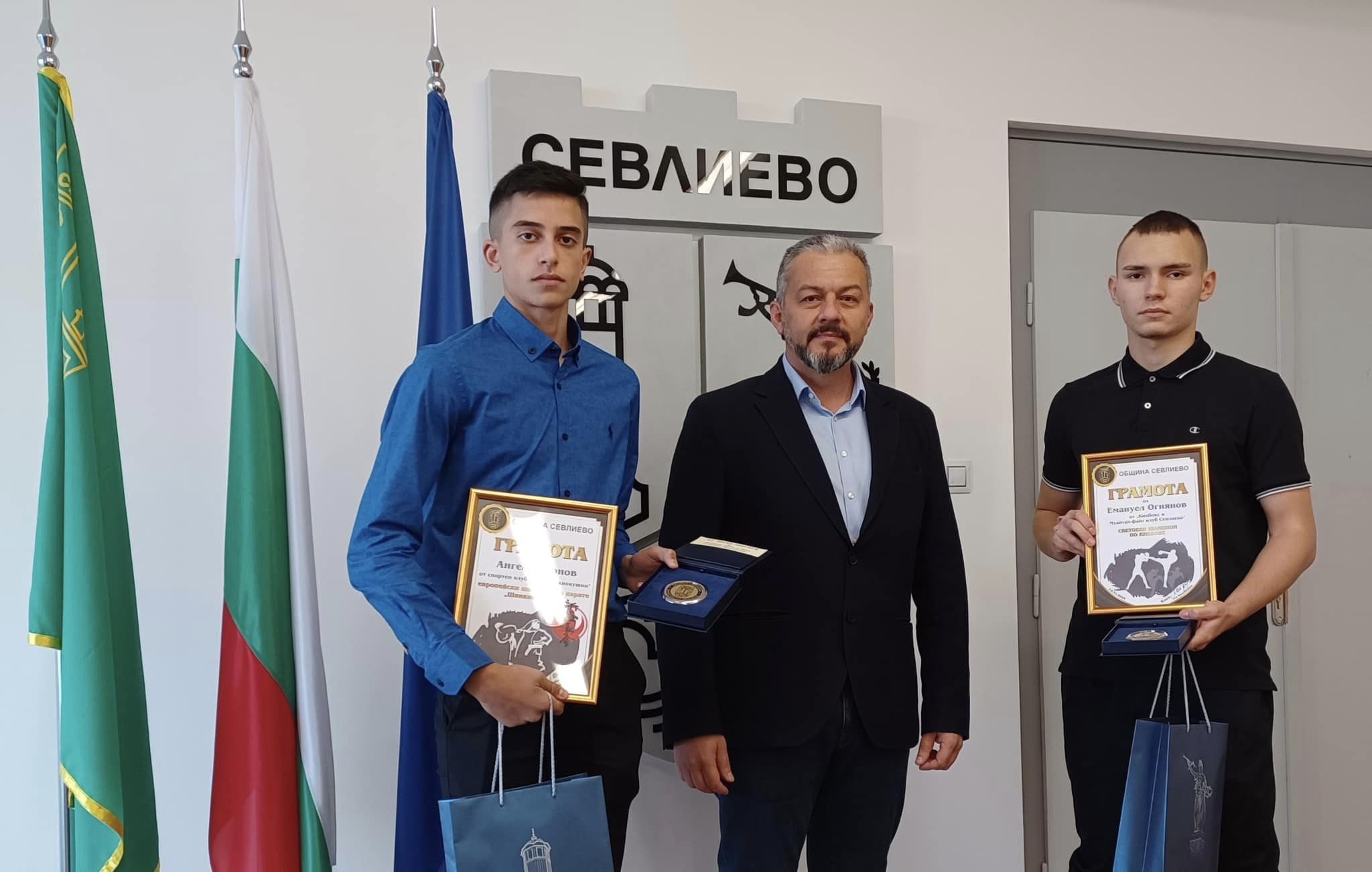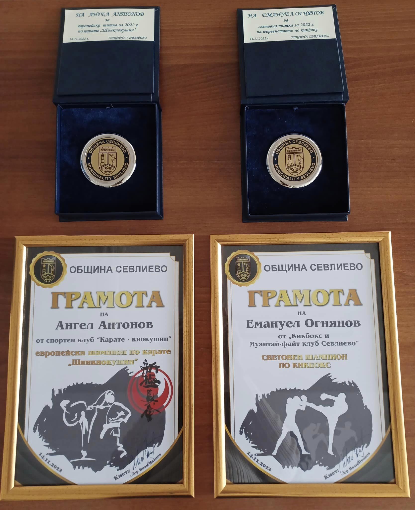 Почетни плакети и грамоти от Община Севлиево получиха първият в историята на местния клуб по кикбокс и муайтай световен шампион Емануел Огнянов и европейският шампион по карате Ангел Антонов. Кметът на общината д-р Иван Иванов се срещна двамата носители на тазгодишните титли и ги поздрави за потигнатите успехи.