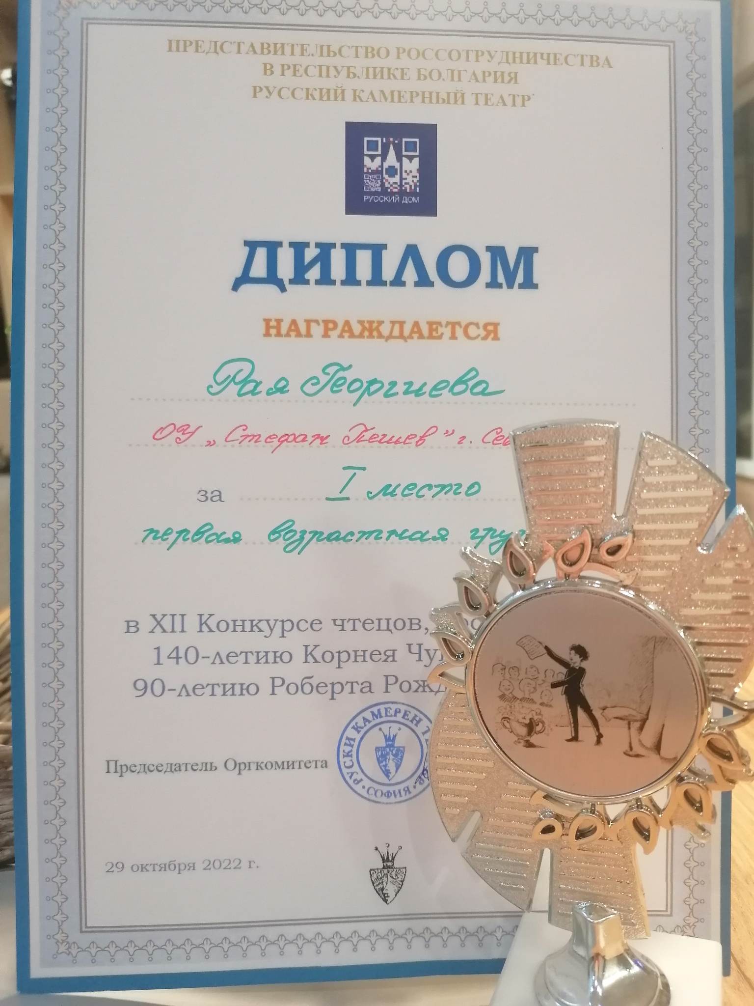 Тази година нашият град бе представен от третокласничката от ОУ ”Стефан Пешев” Рая Георгиева. Тя изпълни артистично и на прекрасен руски език приказка в стихове от К. Чуковски и напълно заслужено грабна първото място. Участниците бяха оценявани от петчленно жури – актьори от Руски камерен театър към РКИЦ. Победата на Рая е изключително ценна, тъй като тя се състезаваше с връстници от Руски лицей – София и училища с ранно чуждоезиково обучение по руски език, където децата са предимно от руски или смесени бракове. Това е третата победа на нашето талантливо момиче във фестивали на руски език. Тя има още две завоювани първи места на 7-ми и 8-ми Национален фестивал за руска поезия, песен и танц „Пусть всегда будет солнце!”. За първото си място във фестивала за рецитатори Рая бе удостоена с Диплом и красива статуетка. Диплом за висок професионализъм получи и нейната преподавателка по руски език Наташа Колева.