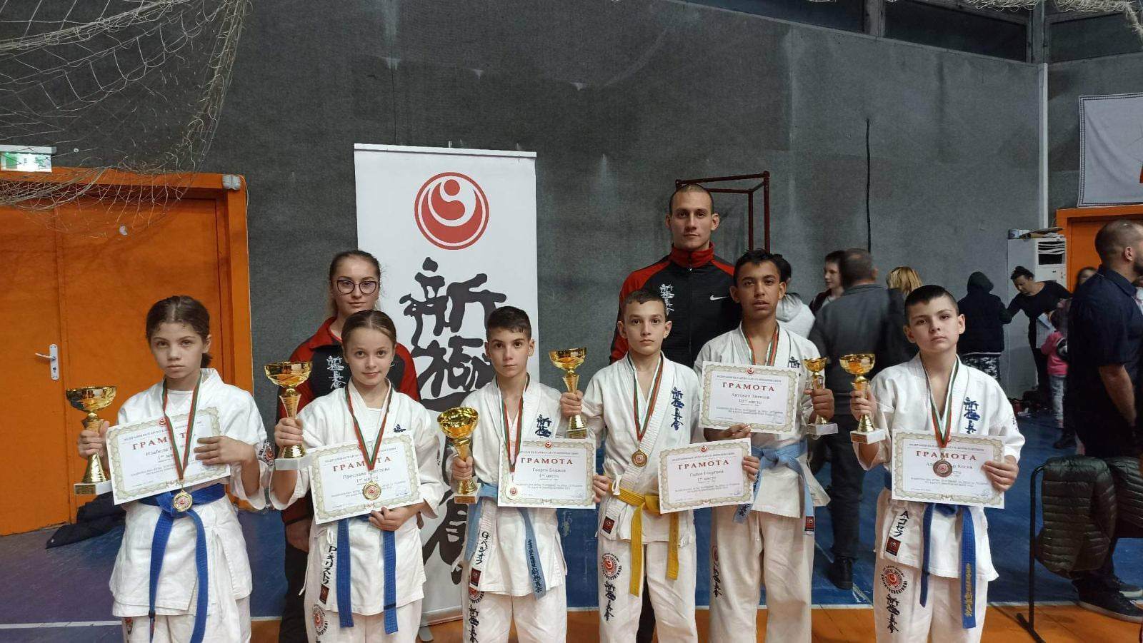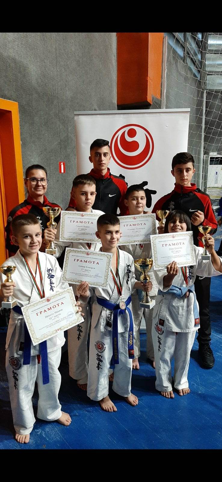 При най-малките клубът ни беше представен от шестима каратисти. На първо място се класираха Георги Илиев /кат. 43 кг/ и Самир Кокоров /кат 28 кг/. На второто място на почеетната стълбица се изкачи Момчил Димитров /кат. +43 кг/. С бронзови отличия се завърнаха Никола Иванов /кат. 34 кг/ и Дара Цанкова /кат. 30 кг/. За съжаление шестият наш участник Илиас Акифов /кат. 30 кг/ не успя да влезе в тройката. Състезателите бяха водени от сенпай Ирена Трифонова, с помощници Ангел Антонов и Константин Матев и сенпай втори дан Ивайло Иванов, който участва и като съдия. На турнира той получи официално сертификатът за втори дан.