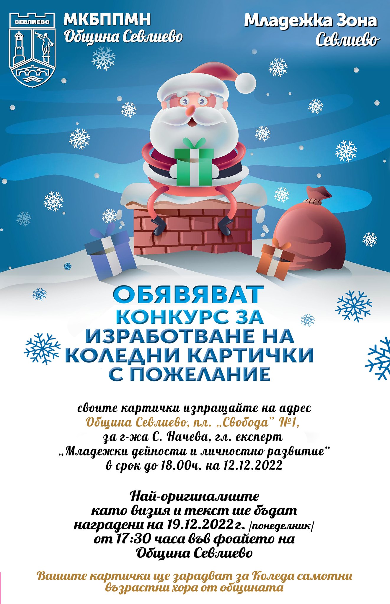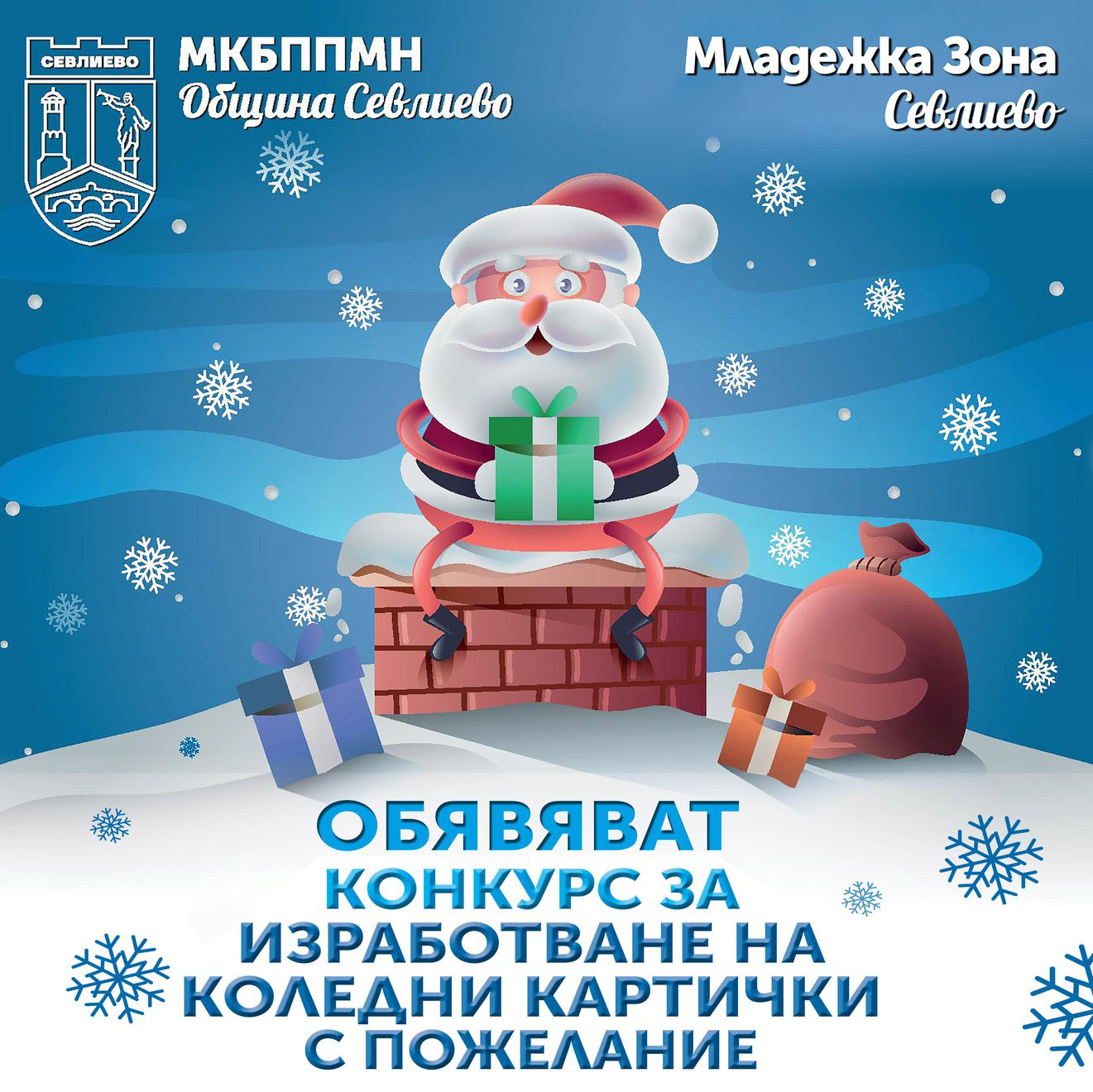 Местната комисия за борба срещу противообществените прояви на малолетните и непълнолетните (МКБППМН) при Община Севлиево, подпомагана от Младежка зона – Севлиево, обявиха традиционния конкурс за коледна картичка, в който могат да се включат всички деца и младежи на територията на общината. Целта е подрастващите да бъдат провокирани и мотивирани да изработят коледна картичка, която ще бъде изпратена на самотен човек от община Севлиево.