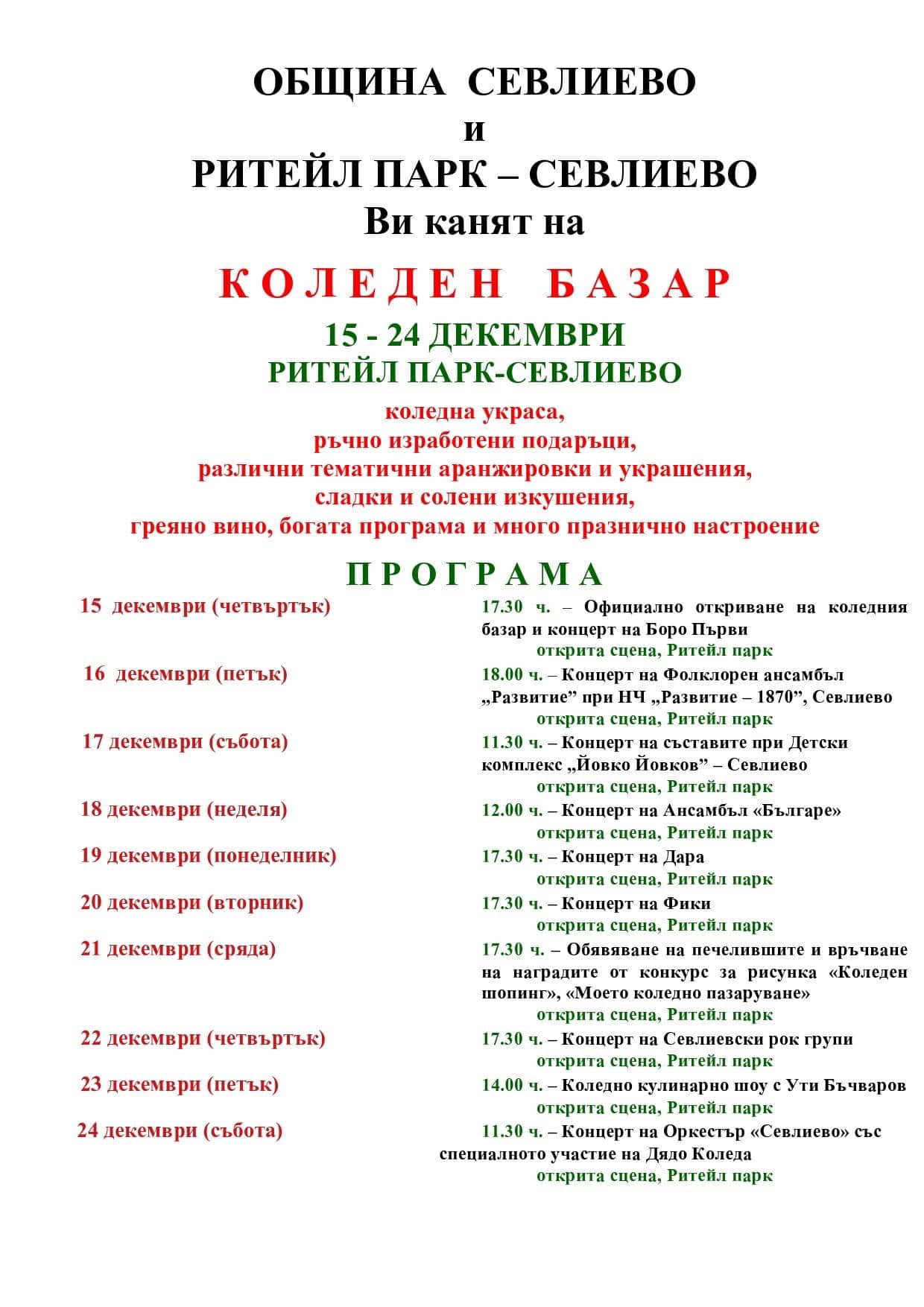 Община Севлиево и Ритейл парк – Севлиево канят всички жители и гости на града на най-големия Коледен базар, който ще се проведе от 15 до 24 декември. Севлиево ще има своята незабравима Коледа, наситена с много изненади, подаръци, награди, ваучери за пазаруване на различна стойност, спортни състезания, игри, томболи, безброй концерти и кулинарни приключения. Всеки посетител на базара ще може да се потопи в уютната атмосфера, благодарение на красиво декорираните коледни щандове, на които местни търговци производители ще предлагат своите ръчно изработени подаръци.