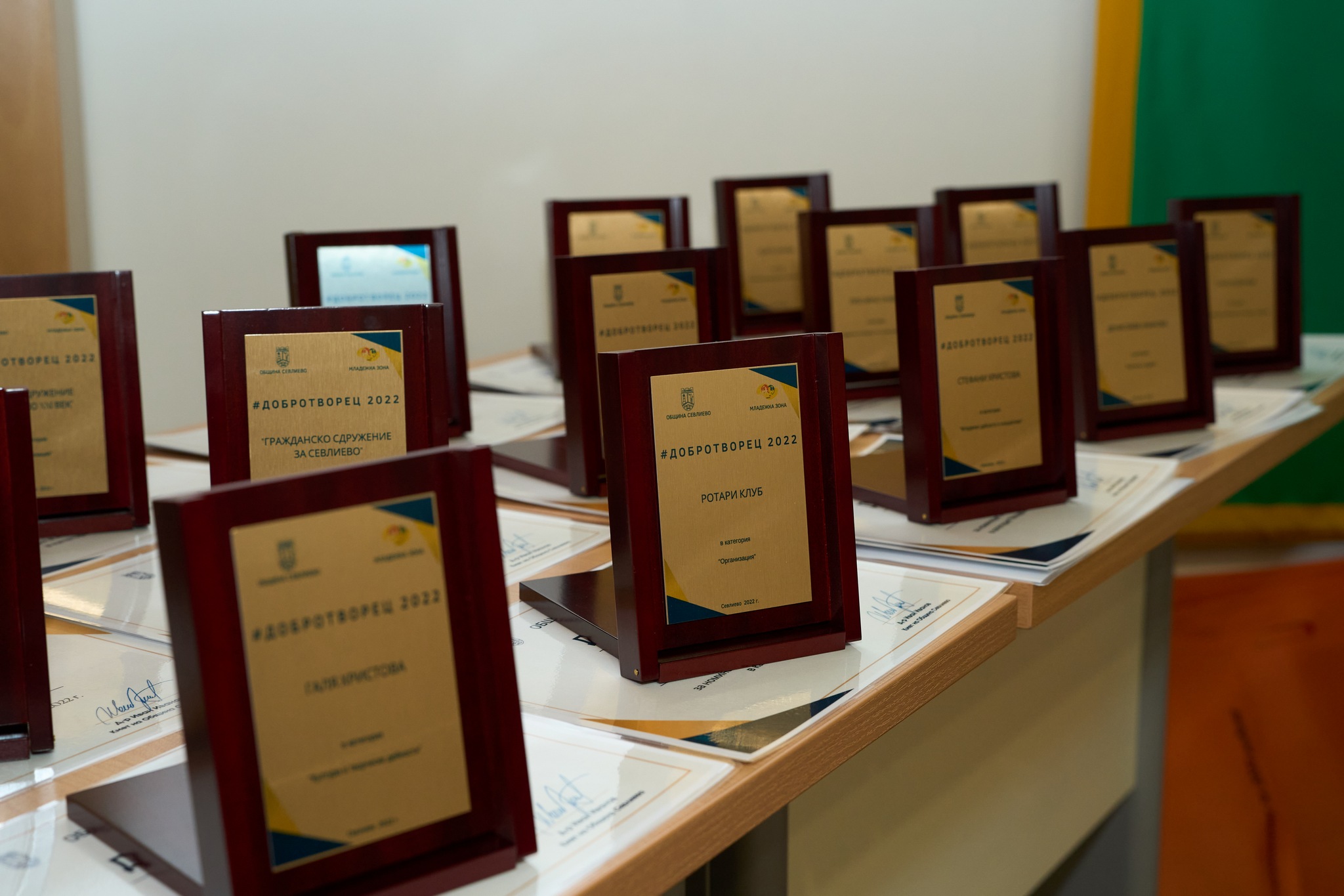 В категория „Организация“ бяха отличени Бизнессдружение “Севлиево XXI век”, „Гражданско сдружение за Севлиево“ и „Ротари клуб“. В категория „Доброволец ветеран“ за гражданско доброволчество награда получи Светлана Георгиева – председател на „Гражданско сдружение за Севлиево“ и Атанас Христов от Планинска спасителна служба – отряд Севлиево. Всички номинирани получиха диплом и екологичен подаръчен комплект „Добротворец 2022“, с пожелание да продължават с добрите дела.