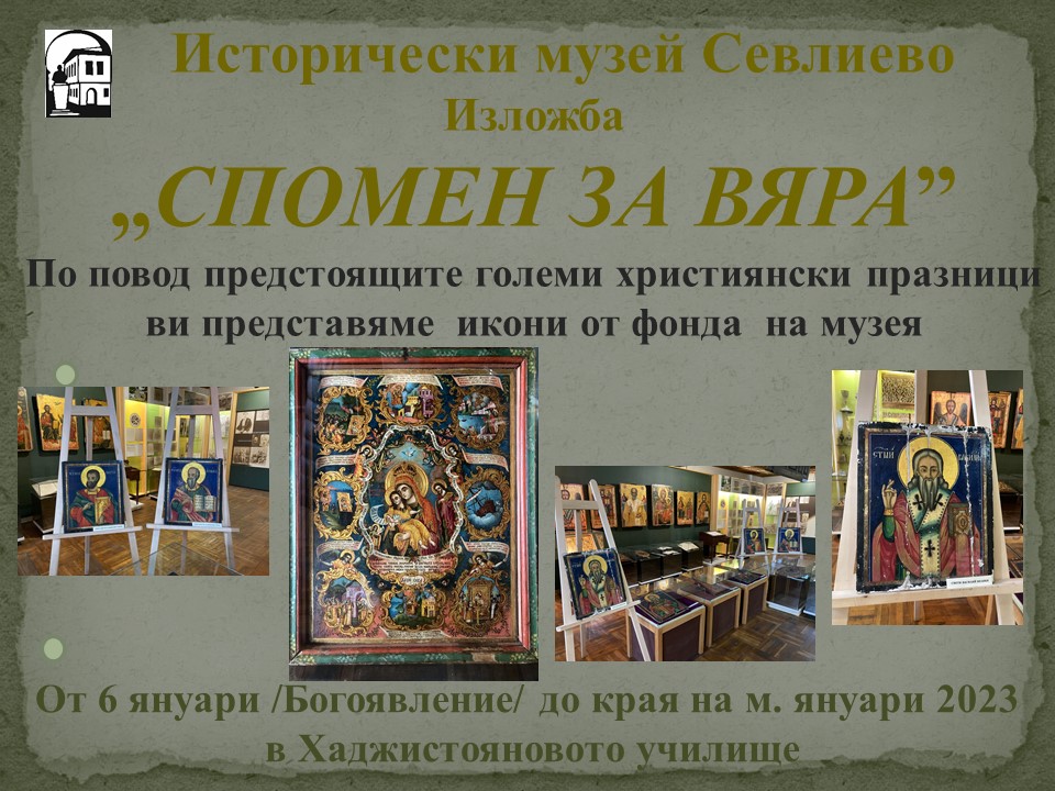 „Спомен за вяра“ е първата за 2023 година изложба, която ще бъде открита днес в Хаджистояновото училище. В нея ще бъдат показани икони от фонда на музея, а поводът са големите християнски празници Йордановден и Ивановден.