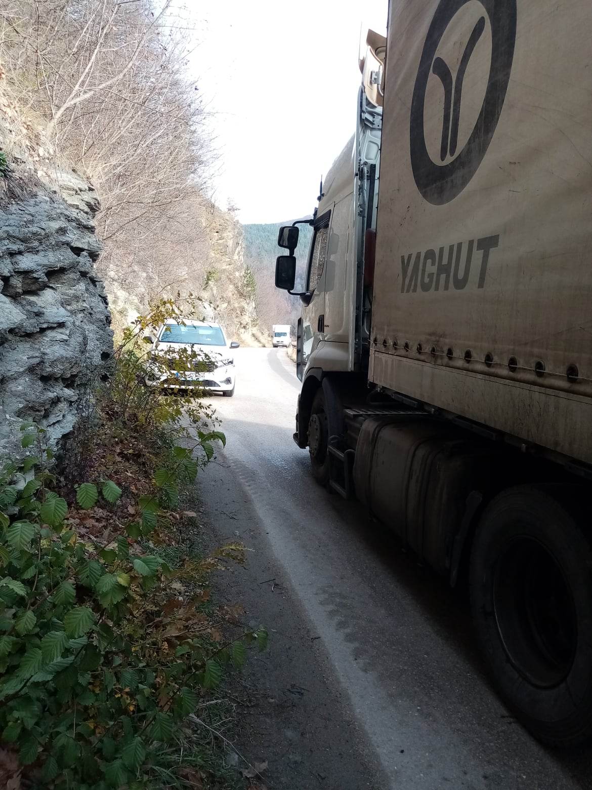 Само на няколко километра от него видяхме обозначения с бализи на друго свлачище – най-опасното, по пътя Стоките – Кръвеник. Пътят е ограничен от дясната страна от скали, които постоянно създават проблеми от падащи камъни. Свлачището е с над 20 метра дълбочина и мантинелата едва ли би помогнала при ПТП. Докато снимахме опасния участък, на пътя се разминаха два 30-тонни ирански ТИР-ове, които обслужват дърводобивни фирми в района. Единият от камионите беше на сантиметри от обозначителния знак за свлачището, което видимо и за просто око, продължава да се разширява. Ако не се вземат спешни мерки и пътя се прекъсне, това означава затваряне на целия район, както и достъпа до тези фирми между Северната и Южната част на страната.