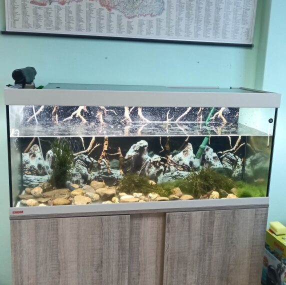 Аквариумът е с площ 0,48 м2. Системата е оборудвана с биофилтър за пречистване на водата, помпа за подаване на въздух във водата, осветително тяло с автоматично изключване и включване на осветлението, уред за охлаждане на водата, термометър. Задната стена на аквариума е аранжирана с тапет, илюстриращ речно дъно.